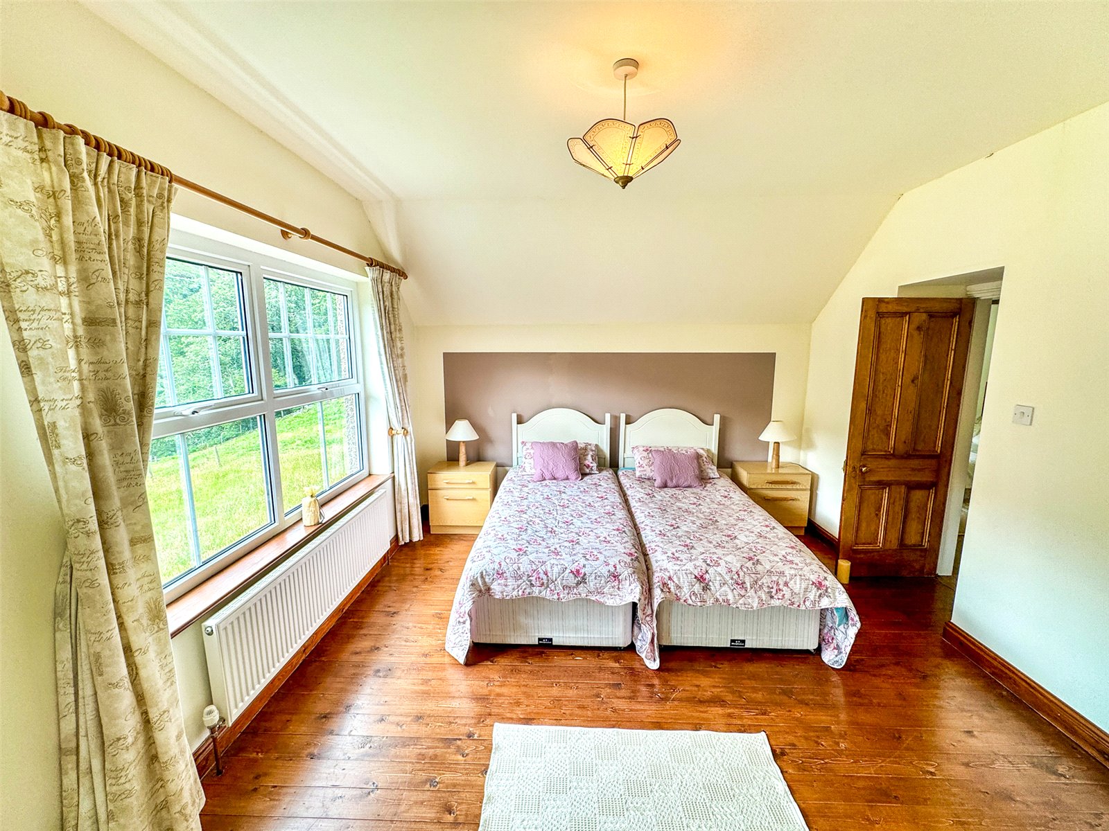 Bedroom 3. A lovely light spacious room again with an en suite Shower Room with pedestal wash basin, WC and double windows overlooking the gardens and woodland to front.