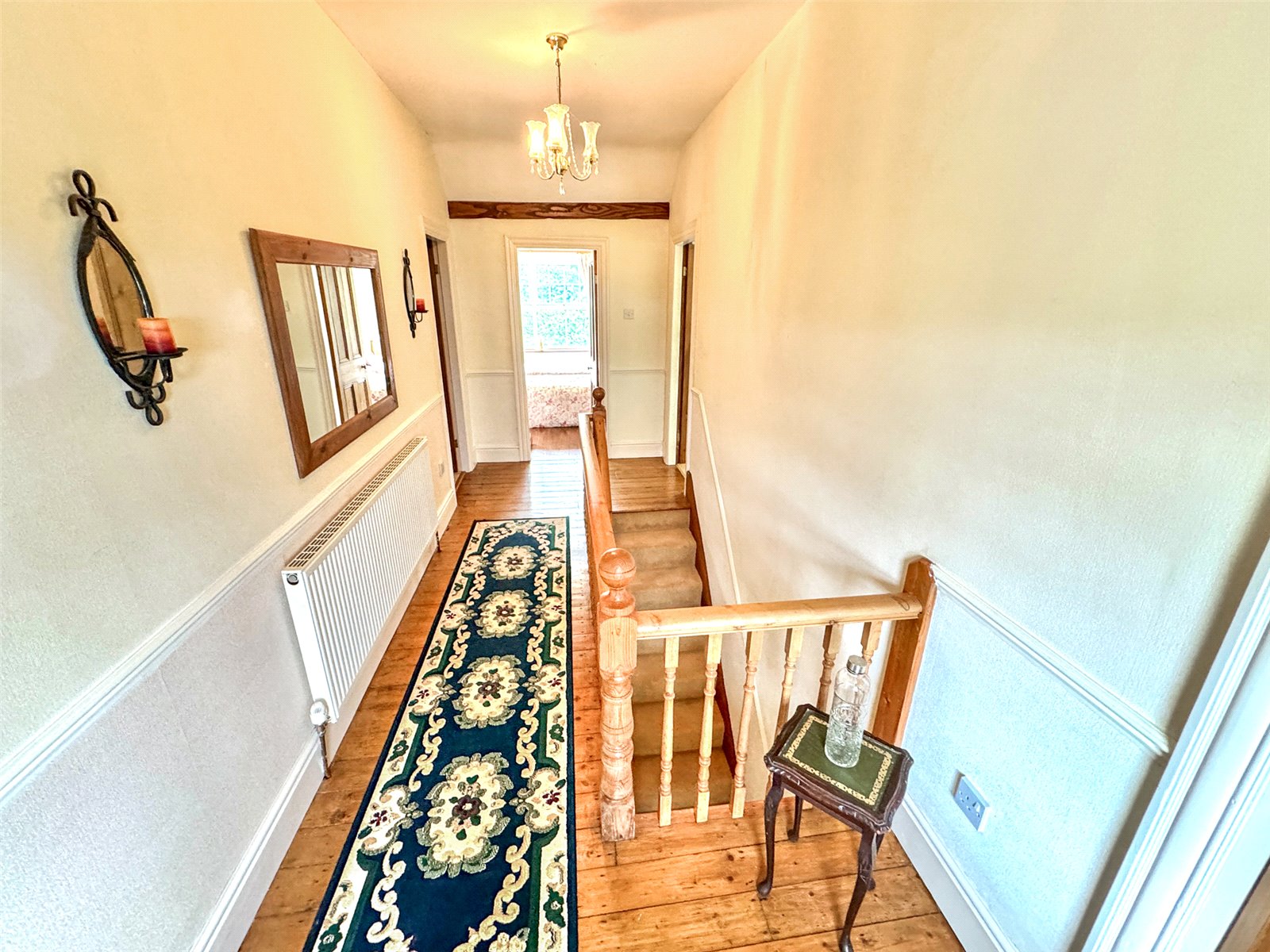 Staircase leads to a landing with an exposed timber floor and radiator.