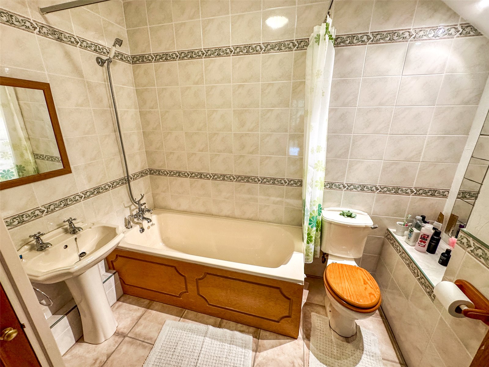 Bathroom with a white suite with shower attachment over bath, WC, pedestal wash basin and an airing cupboard with an insulated cylinder and radiator.