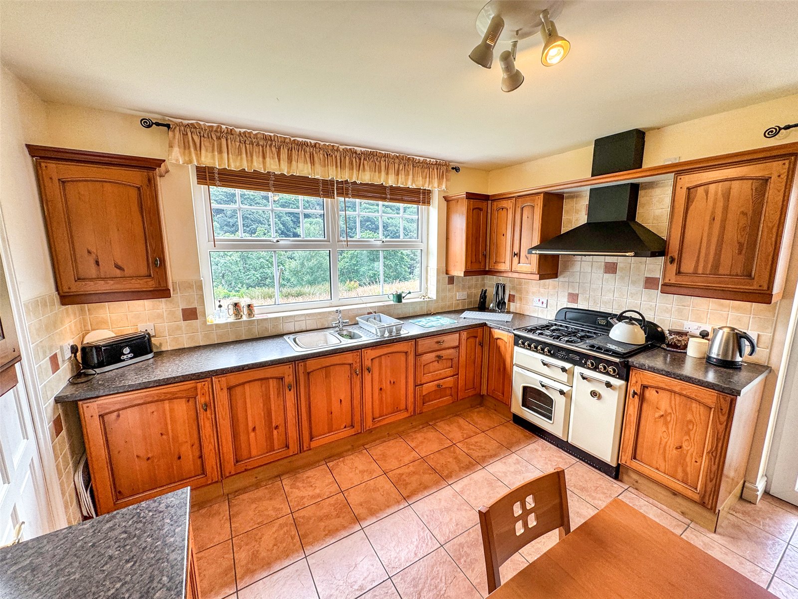 Kitchen a well-equipped fitted Kitchen with a range of traditional style base and eye level units, range type cooker with extractor hood over, radiator, tiled floor and door then leads through to a
