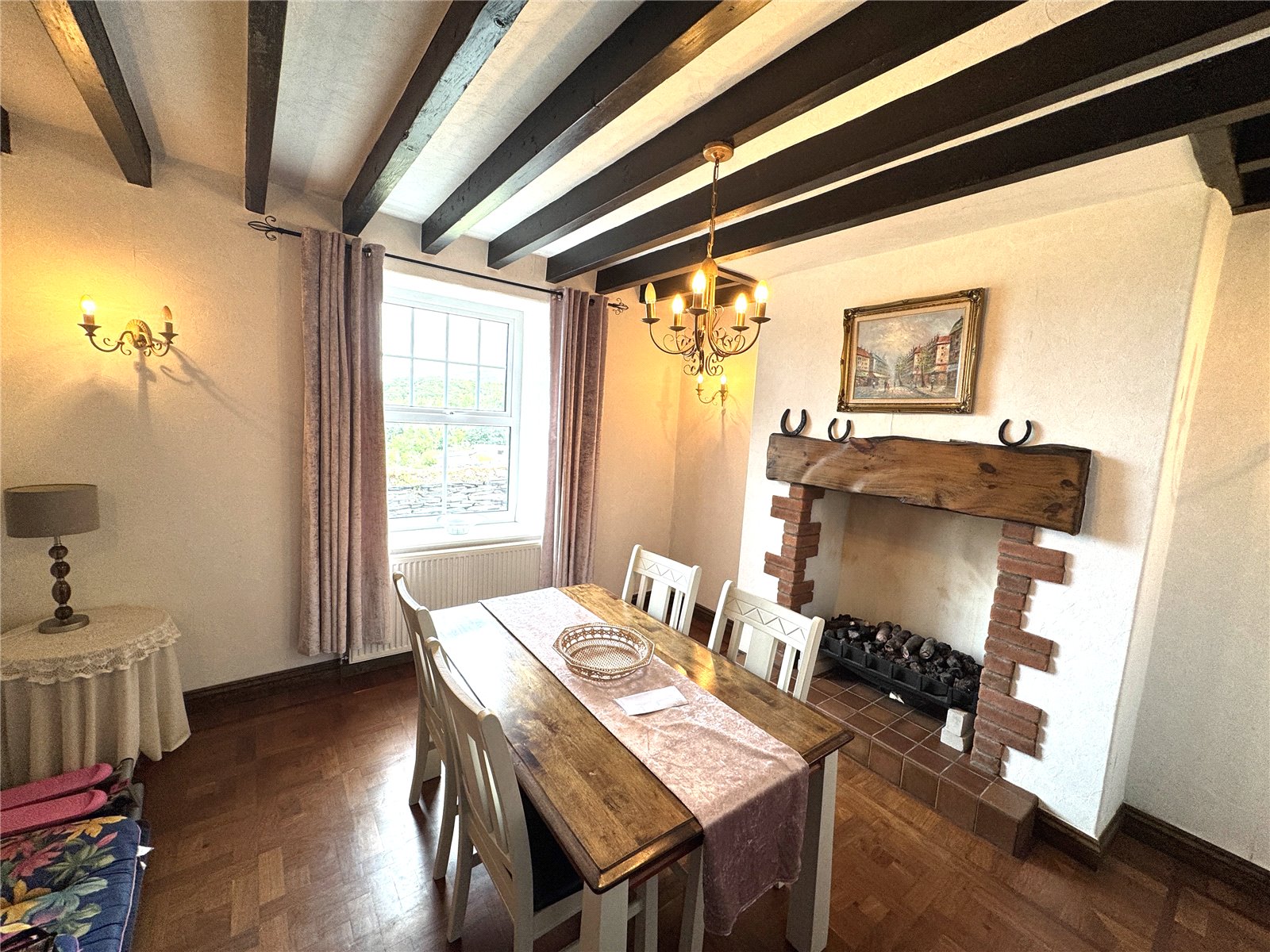 Dining Room with a lovely open fireplace, tiled hearth with an ingle nook beam over, exposed beam ceiling, radiator and a window to front overlooking Cardigan Bay across to the LLyn Peninsula
