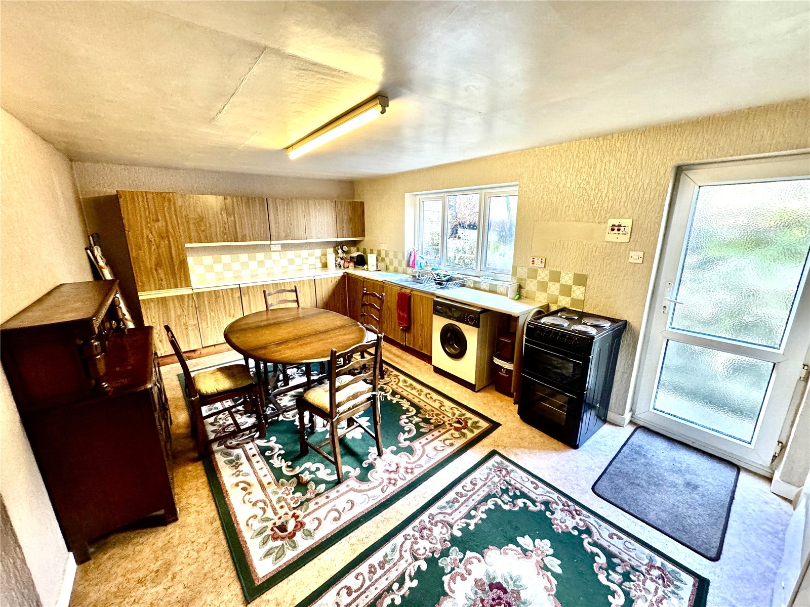 Kitchen; fitted kitchen with a range of base and eye level units, integrated sink unit, plumbing for washing machine, electric cooker point and large under stairs cupboard/larder.