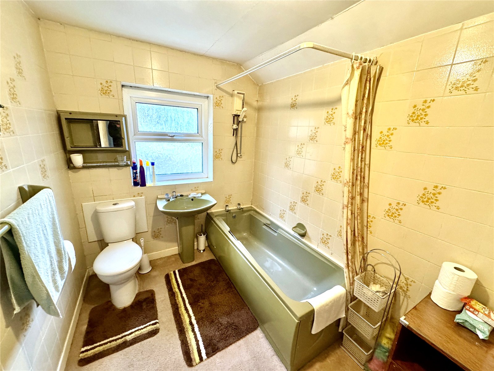 Bathroom; with coloured 3 piece suite and electric shower over bath.