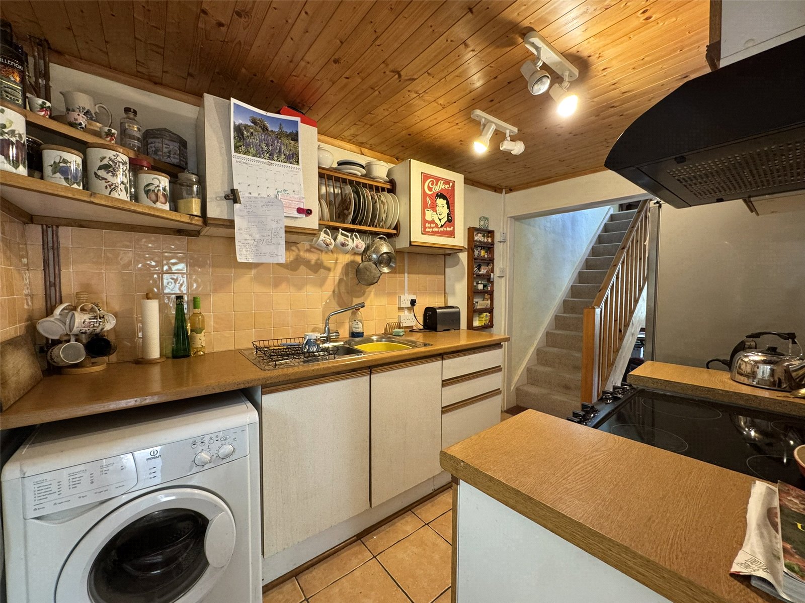 Kitchen/Dining Room (7' x 22'). Dining area to front of property with window overlooking surrounding hillside and stairs off. Kitchen comprises a range of base and unit cupboards to 2 walls with space for appliances and plumbing for automatic washing machine, stainless steel sink unit inset. Ceramic tiled floor and panelled ceiling.