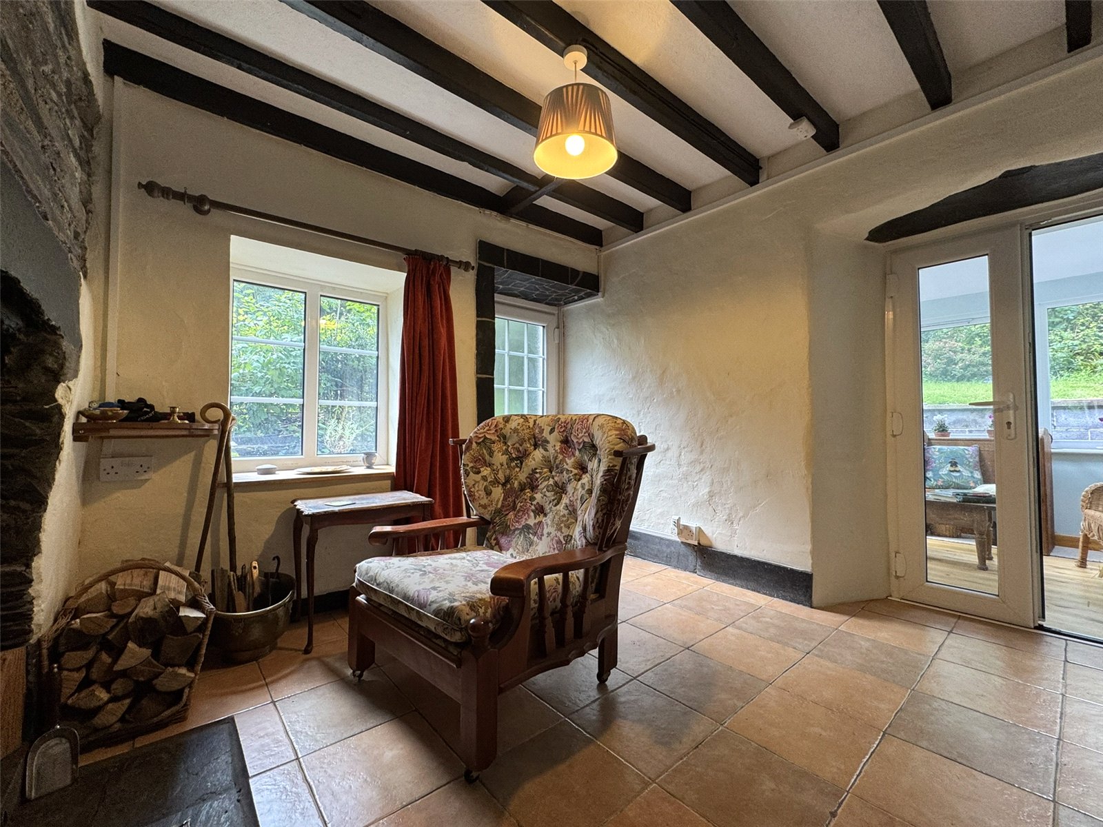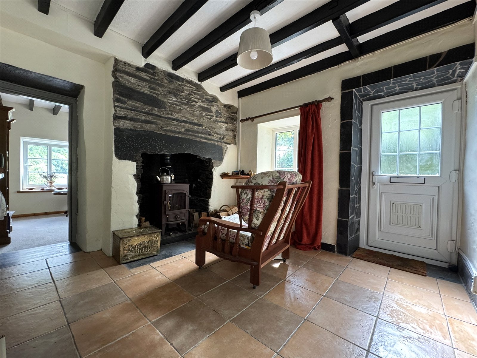 Sitting Room (9' x 9'6) with ceramic tiled floor and exposed beam ceiling. Feature stone wall with fireplace and slate lintel, multifuel stove inset. Doors to