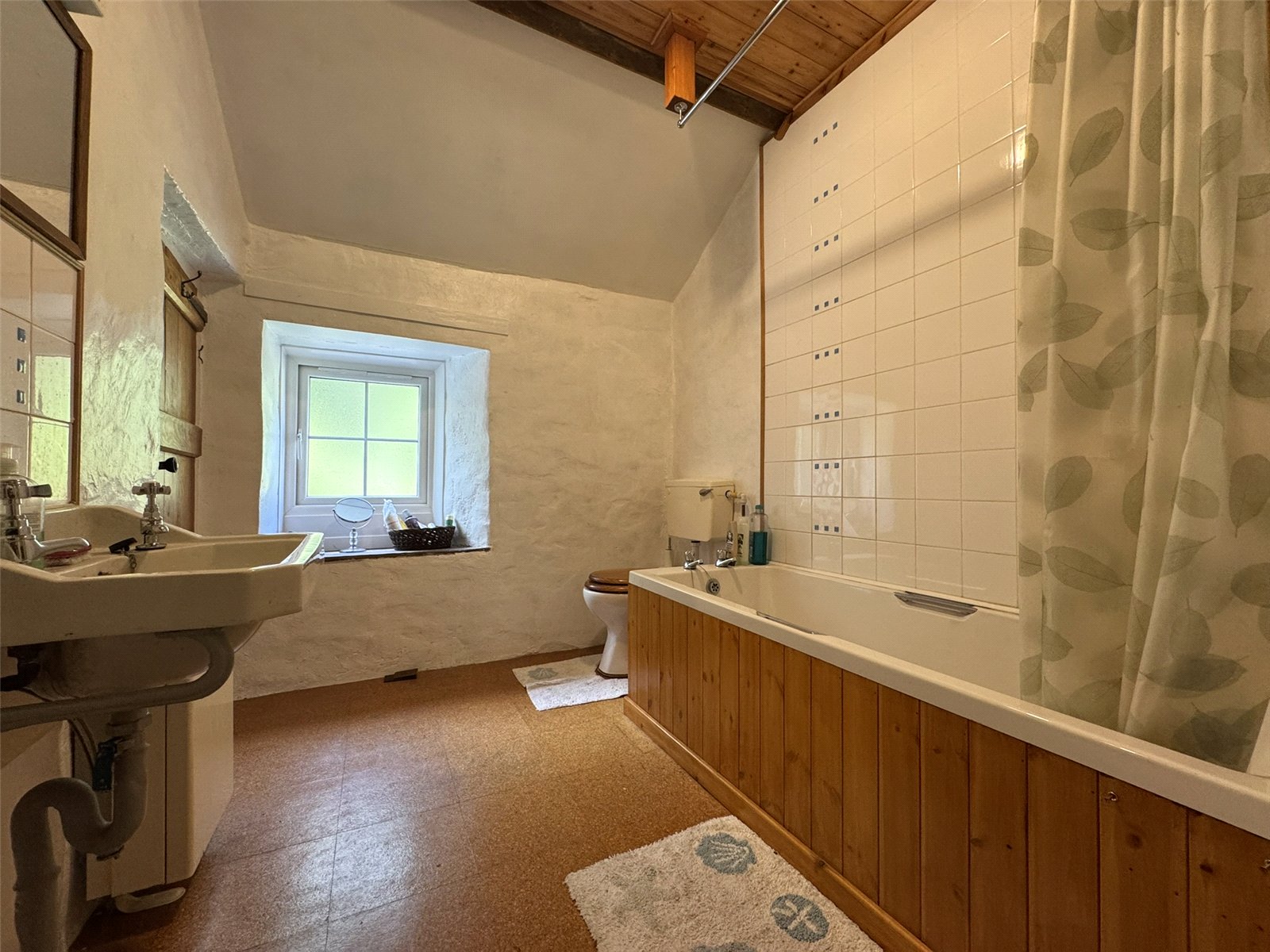 Bathroom (7' x 10'6) with cork tiled floor, night storage heater. Bathroom suite comprising hand wash basin, WC, panel bath with tiled surround and electric shower over and heated towel rail. Airing cupboard housing immersion heater.