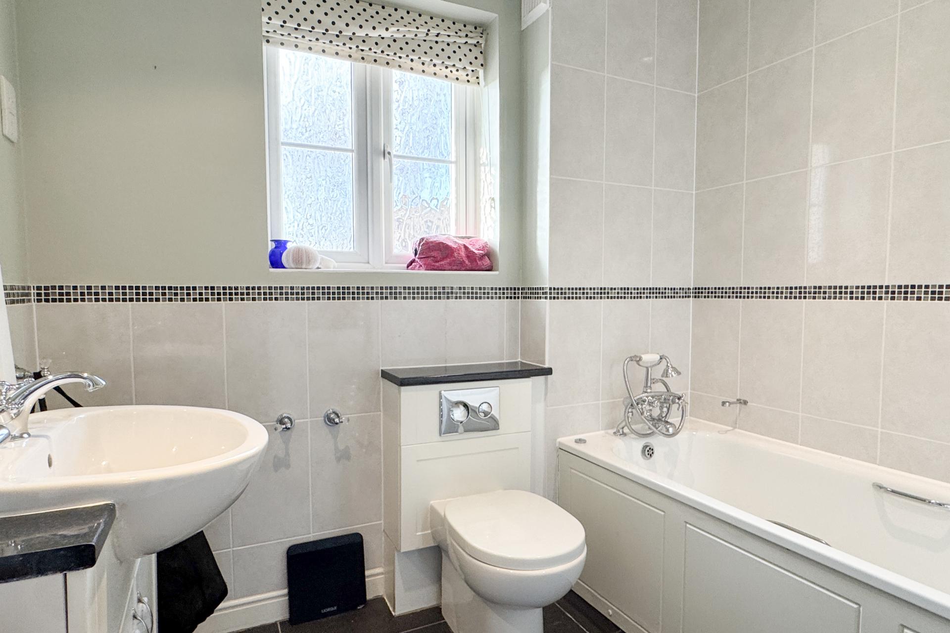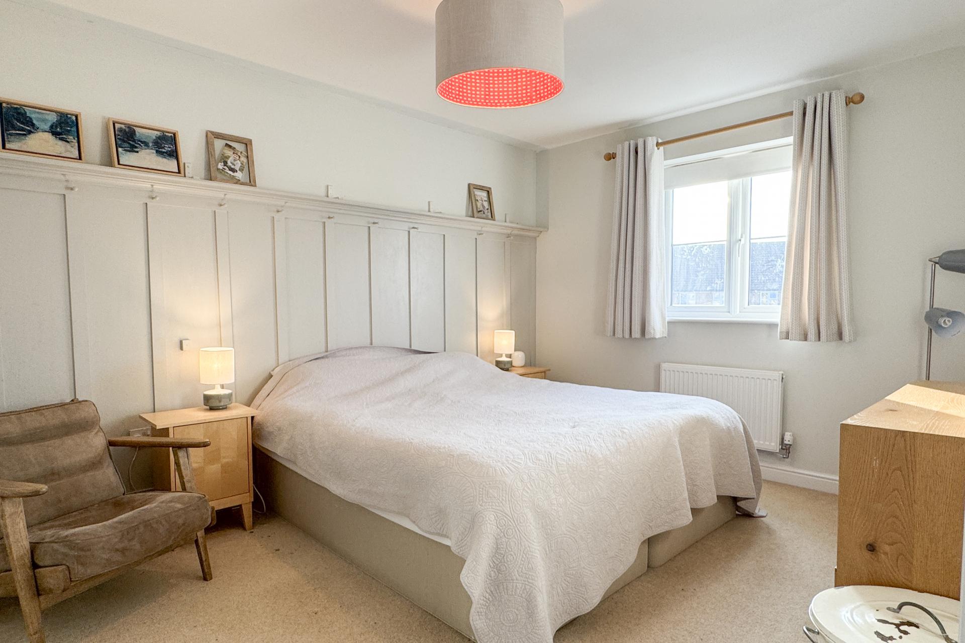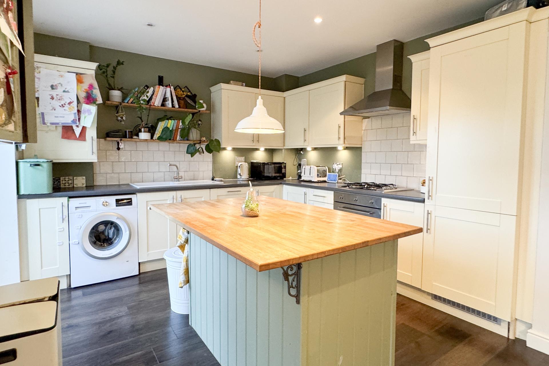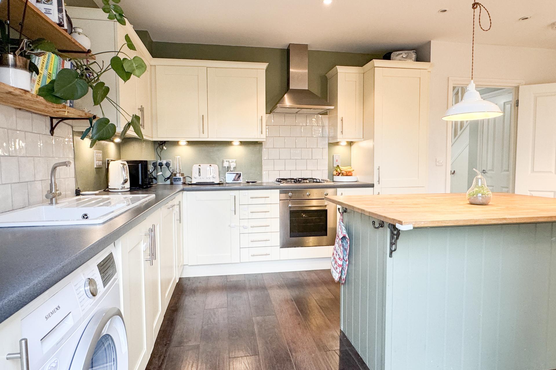 17 Wirethorn Furlong is a beautifully presented four-bedroom family home in the village of Haddenham, offering a spacious and stylish living environment. The property opens into a light and welcoming hallway with patterned tiled flooring. To the left, a downstairs toilet features a white suite, while to the right, a spacious sitting room enjoys a bay window to the front, creating a cosy yet elegant atmosphere. The kitchen diner/family room is at the rear of the house, designed for modern family life, with fitted cream and sage green shaker-style units and a central island with oak worktops. Integrated appliances include a fridge freezer, oven with gas hob, and space for a washing machine, dryer, and dishwasher. This spacious, open-plan area benefits from French doors opening onto the garden, making it perfect for indoor-outdoor living. The first floor features a generously sized second bedroom with an en-suite shower room, along with two further bedrooms overlooking the rear garden. A well-appointed white suite family bathroom completes this floor. The second floor is dedicated to the luxurious master bedroom, which benefits from a walk-in wardrobe and a beautifully designed en-suite shower room. This light and airy space is enhanced by three windows, creating a bright and open feel. The en-suite has been recently renovated to include a rainfall shower, a modern vanity unit, tiled flooring, and a window for natural light. The rear garden is laid to lawn with a patio area, fully enclosed with fencing, and includes gated rear access. The property also benefits from an garage and off-road parking. Situated in a quiet, family-orientated area of Haddenham, this home is conveniently close to shops and the station, offering fast train links to London in approximately 35-40 minutes. This freehold home is ideal for families, young professionals, or downsizers. Annual maintenance charge.