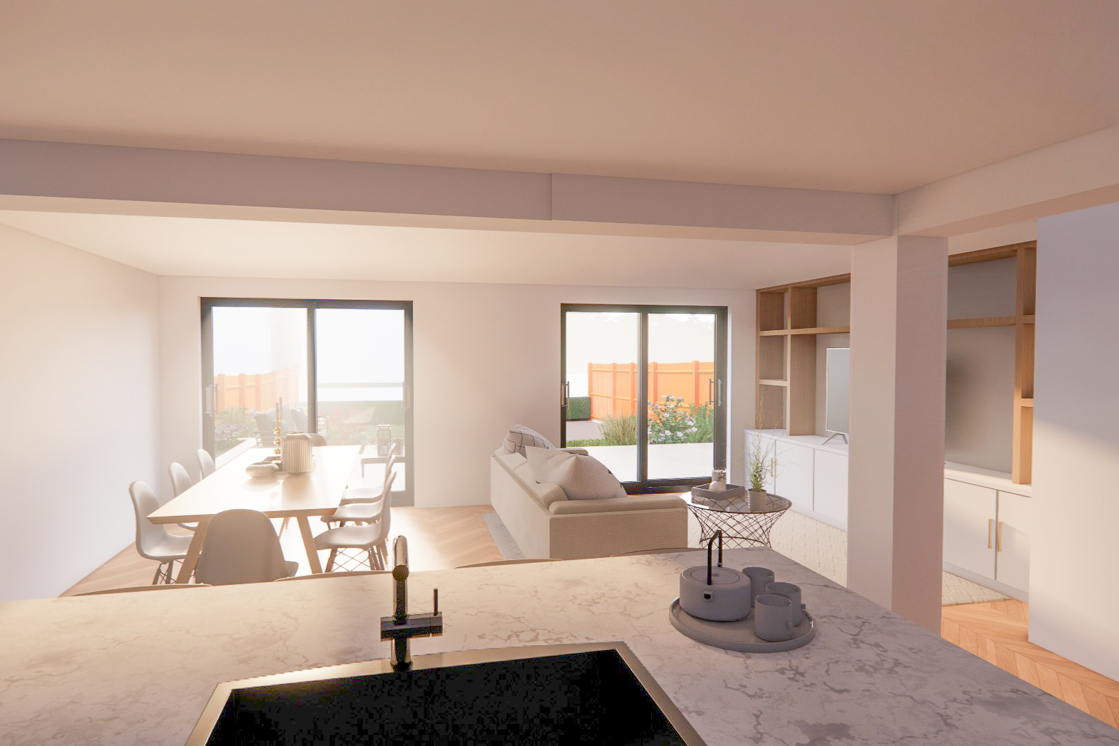 This delightful house offers well-proportioned living spaces and the exciting potential for expansion, with planning permission arranged by local architect, Lin Palmer for a substantial four-bedroom home featuring an open-plan kitchen and dining area.