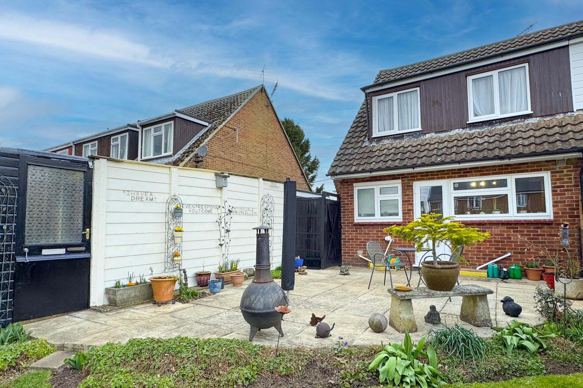 The front garden is mainly laid to lawn. At the rear, the beautifully maintained garden offers a tranquil retreat, featuring a neatly kept lawn, a vegetable patch, and an array of mature shrubs and seasonal bulbs. A spacious patio provides the perfect setting for outdoor entertaining, while a potting shed caters to keen gardeners. A back gate opens onto a garden footpath. The garage offers excellent storage with an additional potting shed at the rear. The private driveway comfortably accommodates multiple vehicles.