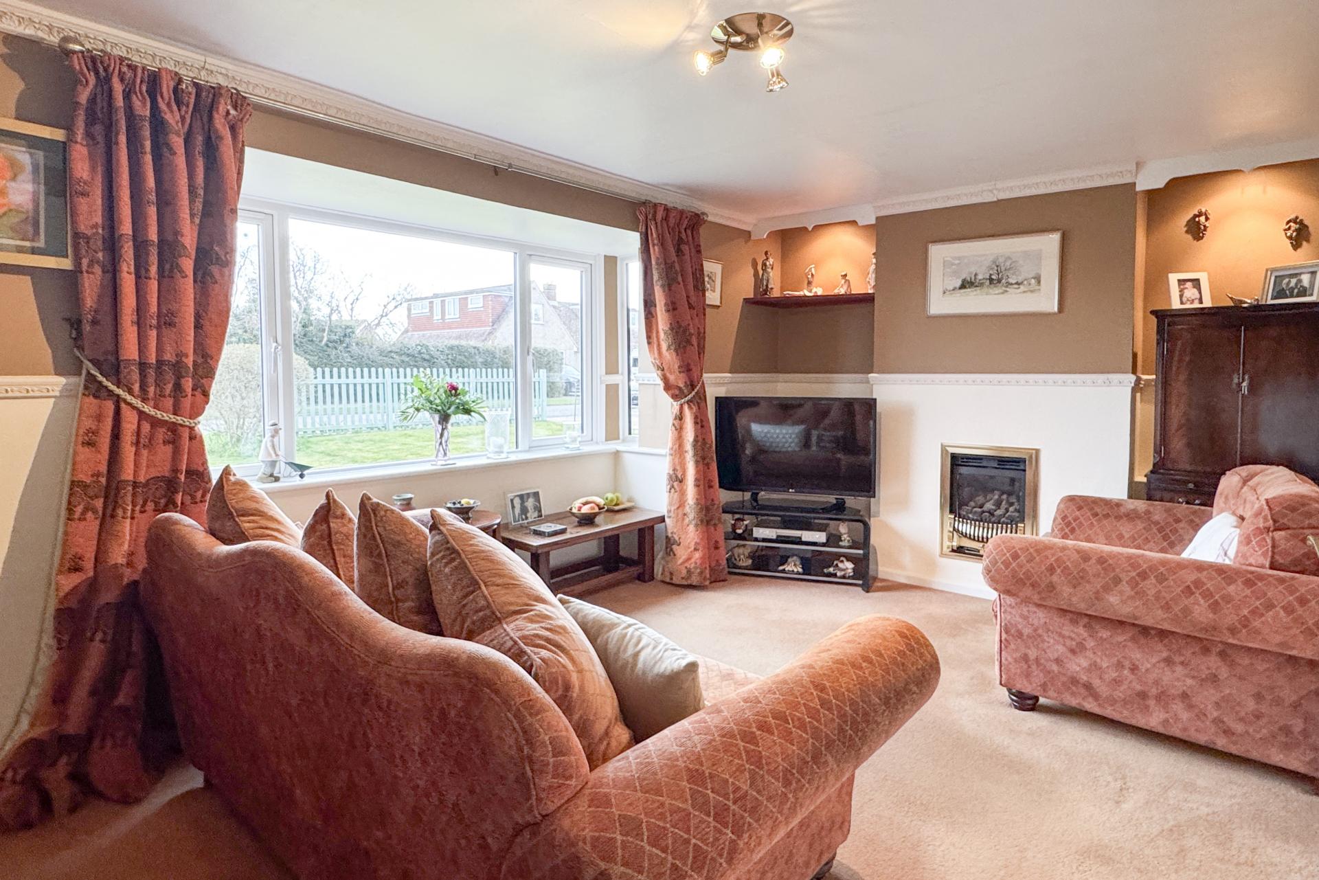 The sitting room is warm and inviting, featuring a gas fire and a charming square bay window to the front, allowing natural light to fill the space.