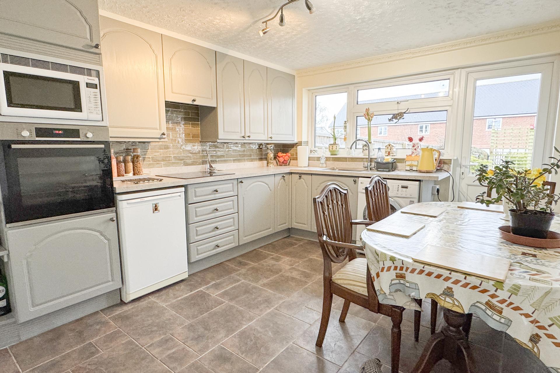 The kitchen is fitted with grey wooden shaker-style units, ample wall and base storage, and a ceramic tiled floor. A door leads out to the rear garden, enhancing the connection between indoor and outdoor living. The kitchen provides space for a washing machine and dishwasher, along with an integrated oven and electric hob.