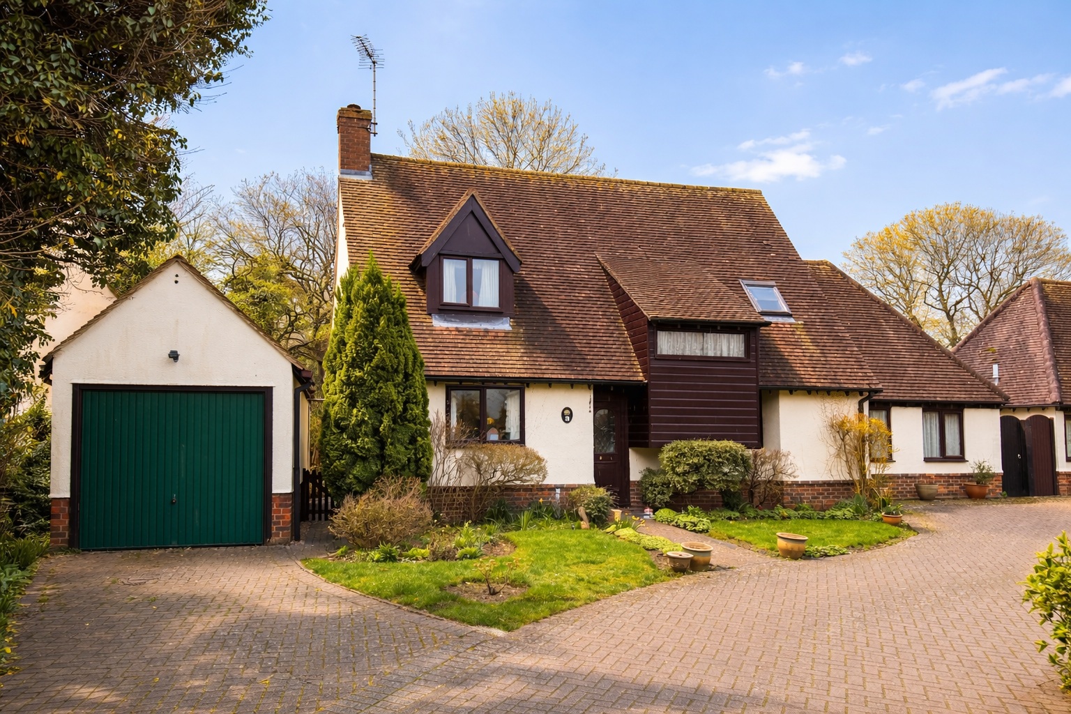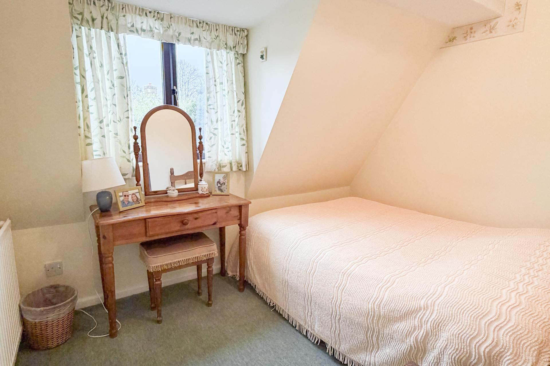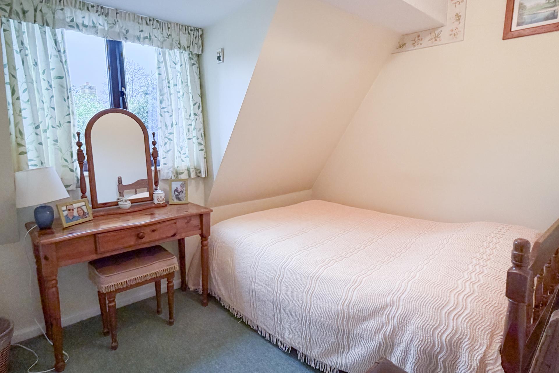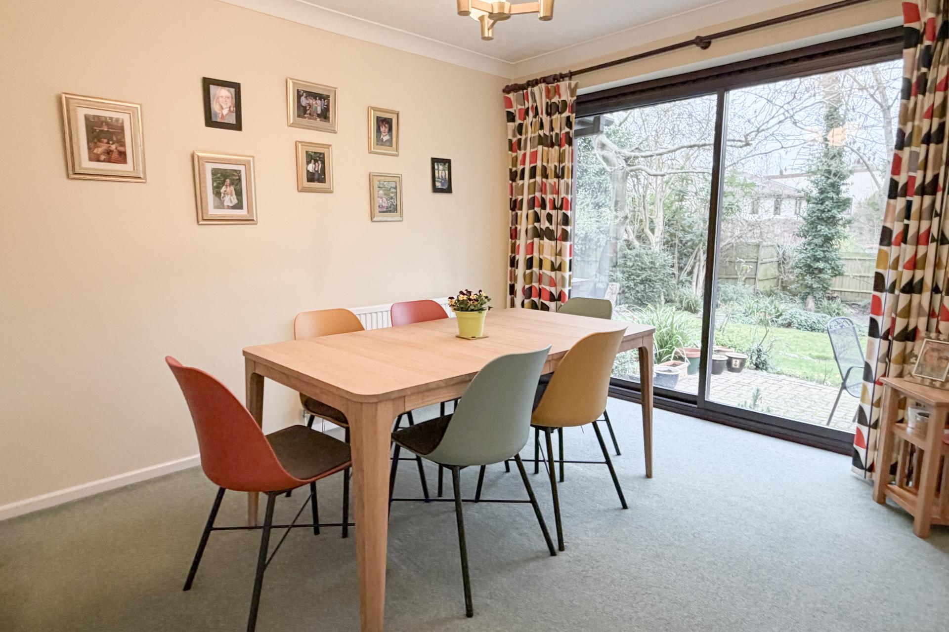 Outside, the rear garden is predominantly laid to lawn and bordered by mature trees and established planting, creating a peaceful and private setting, with some trees subject to covenants. To the front, there is a small garden, together with a single garage and off-street parking. EPC C. Council Tax Band F Gas central heating and mains drainage.