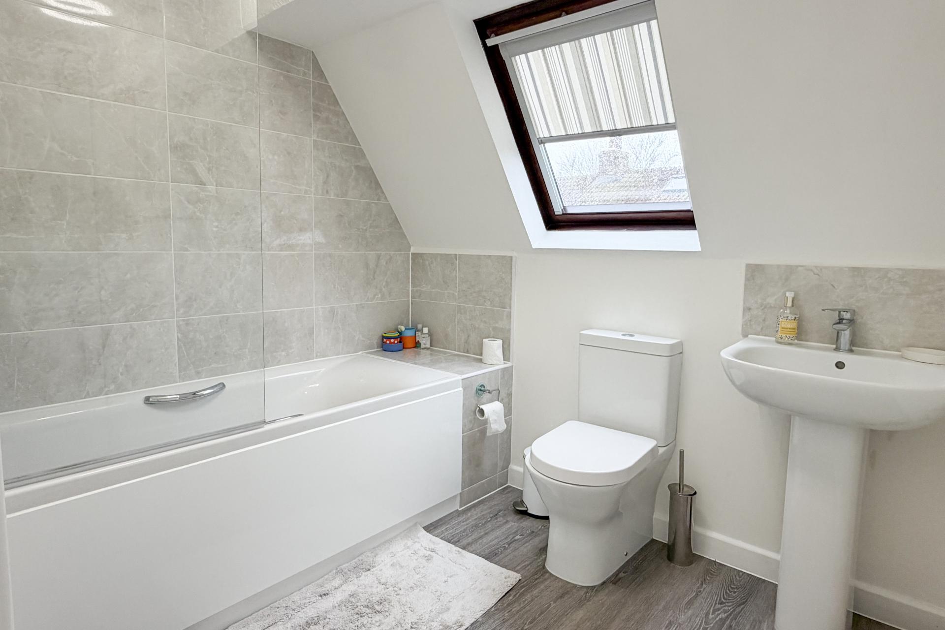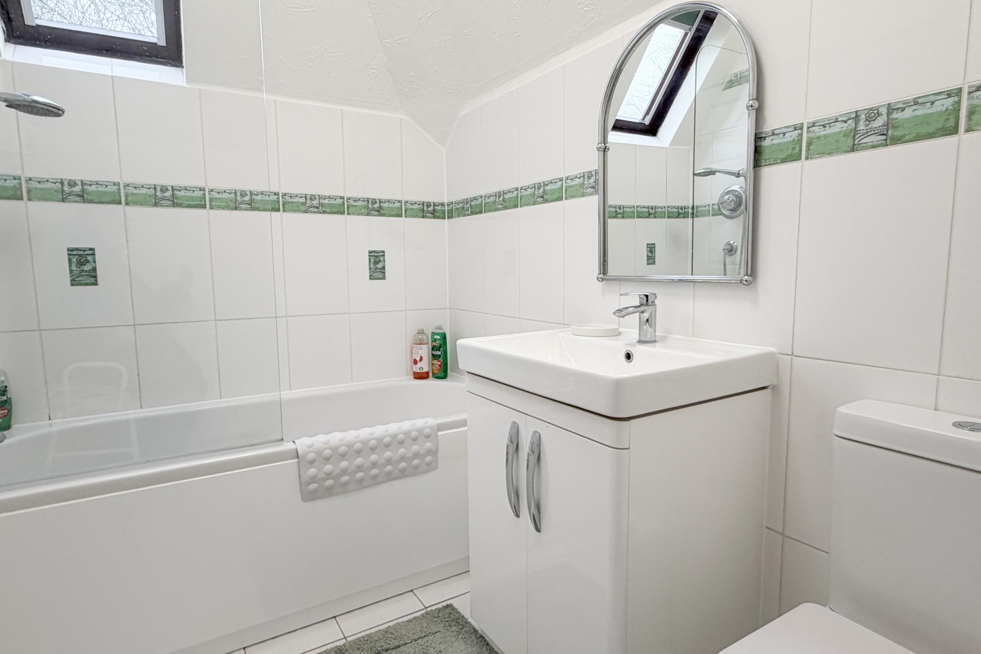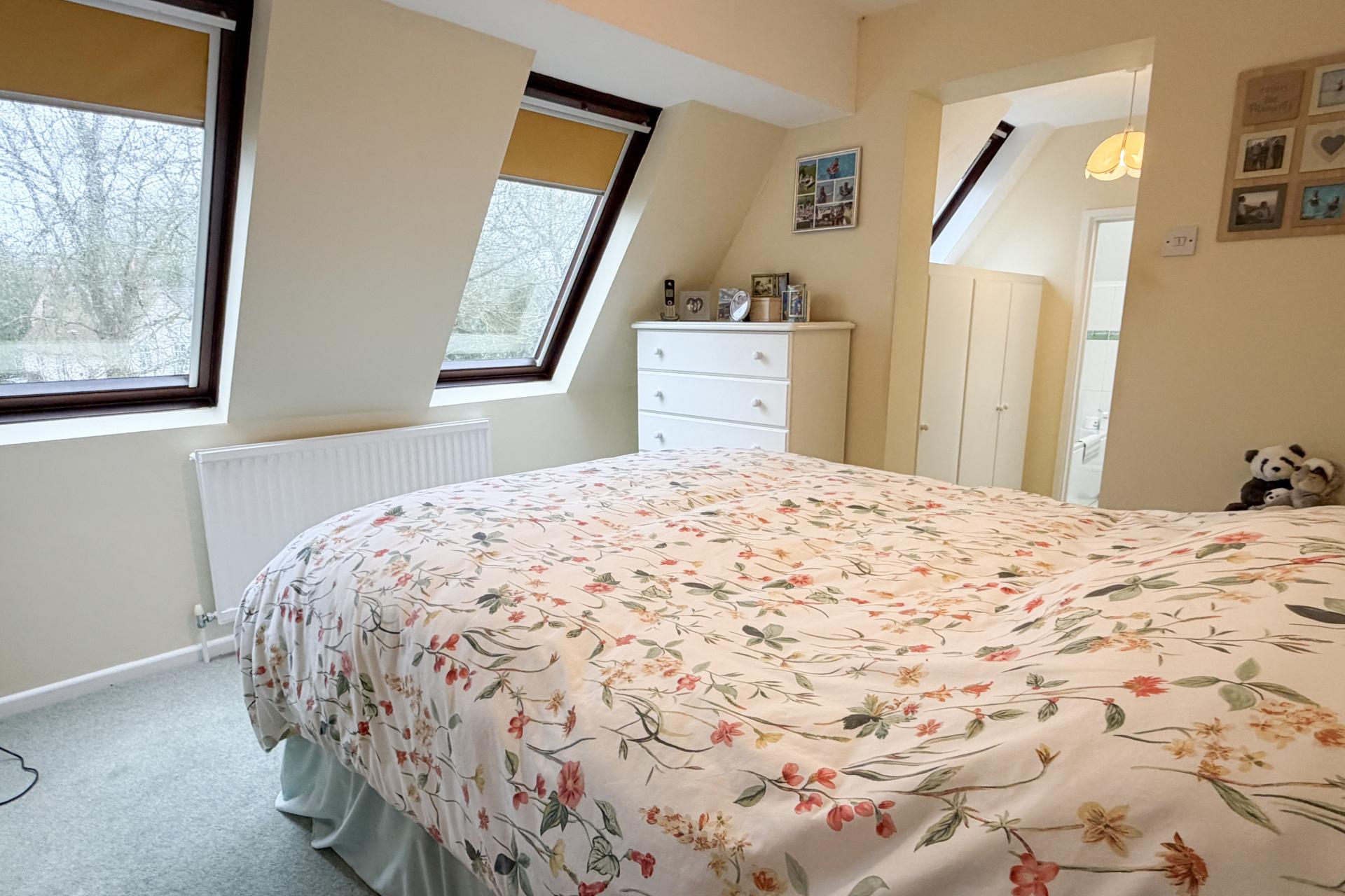 Upstairs, the landing provides access to four bedrooms. The principal bedroom is a generous double, enjoying two Velux windows overlooking the garden, together with a dressing area fitted with built-in cupboards and a private en-suite bathroom. The remaining bedrooms offer flexible accommodation, ideal for family living, guests or a home office. The family bathroom completes the first floor and is fitted with a white suite, Velux window, ladder radiator and a shower over the bath.