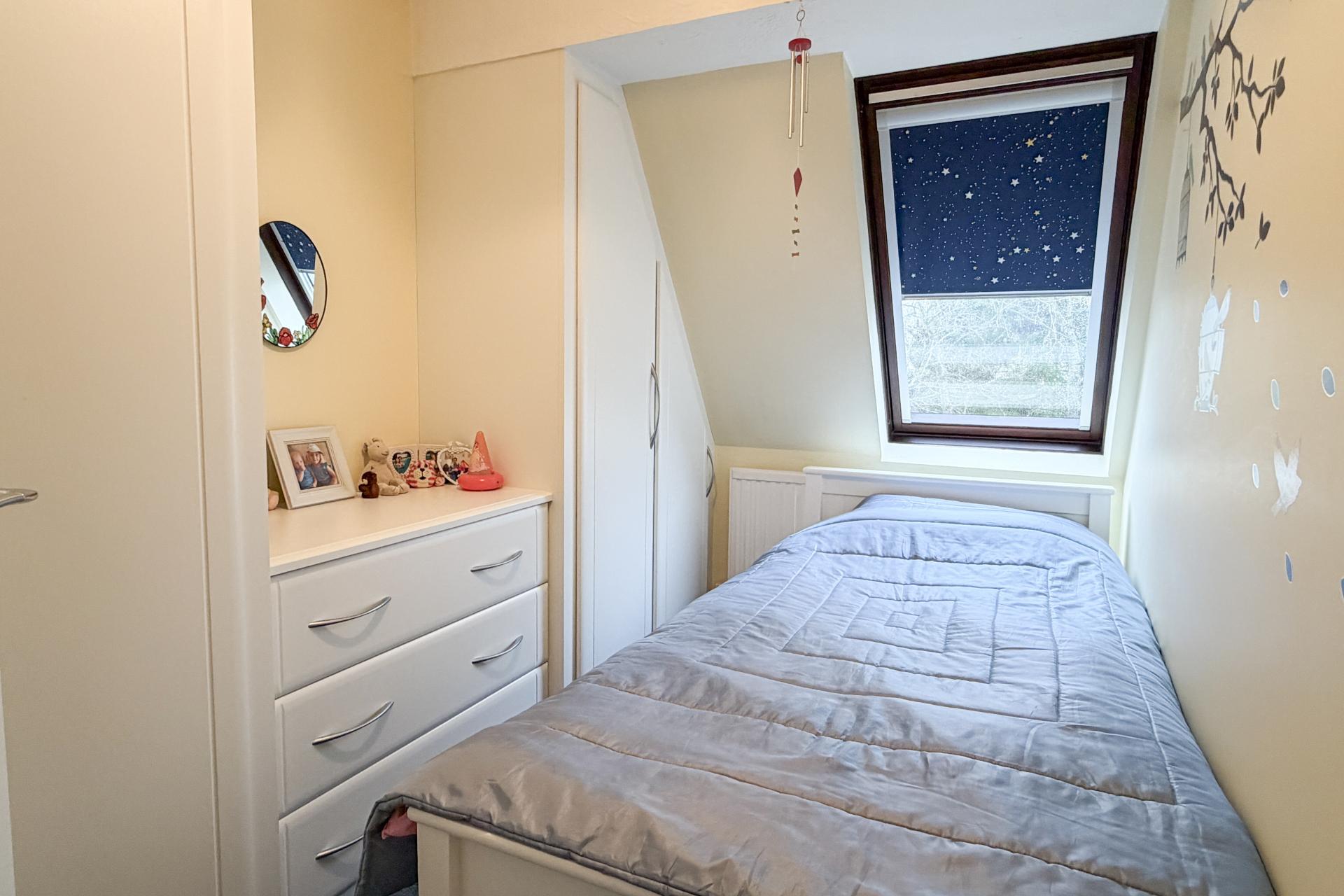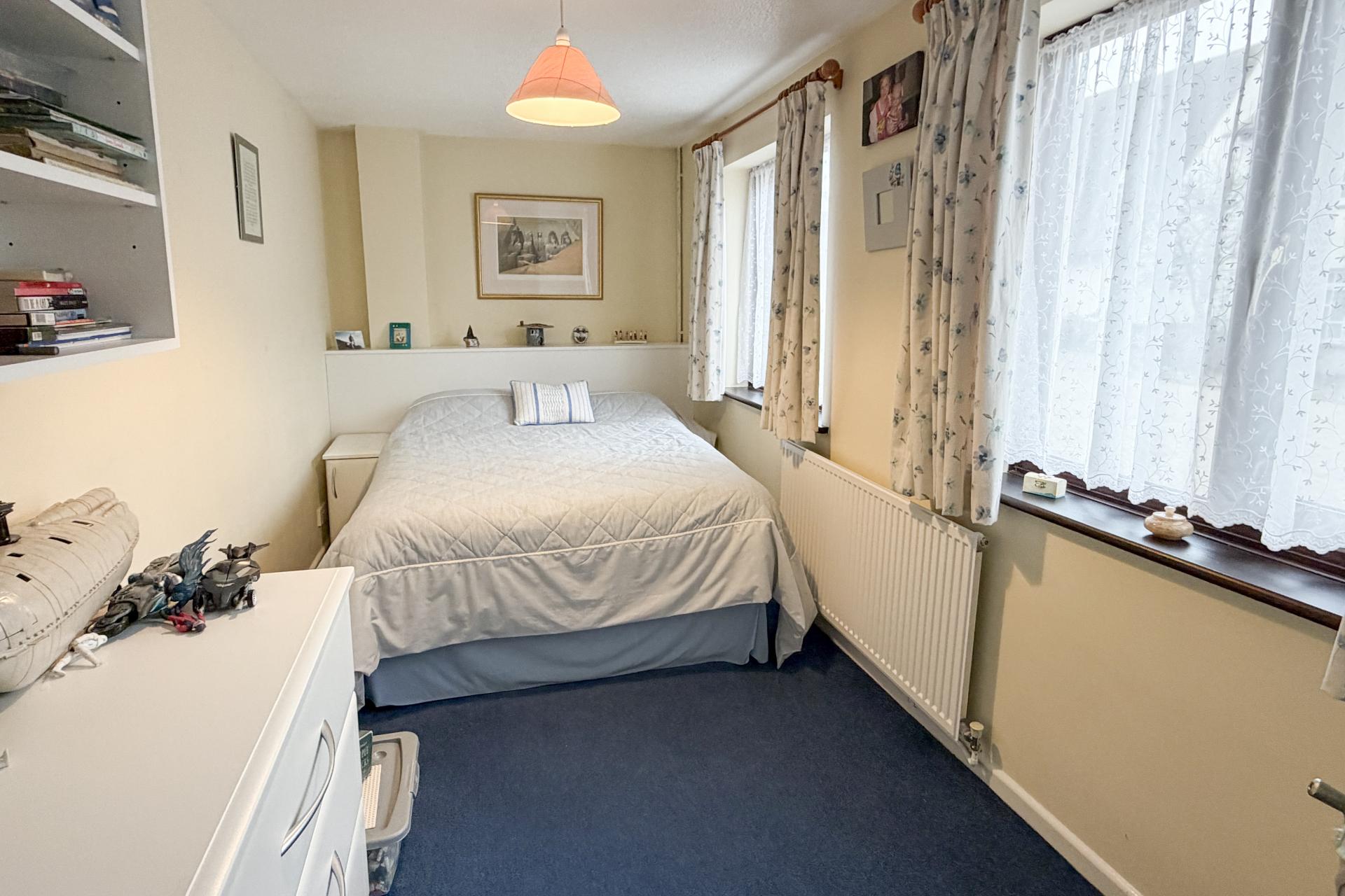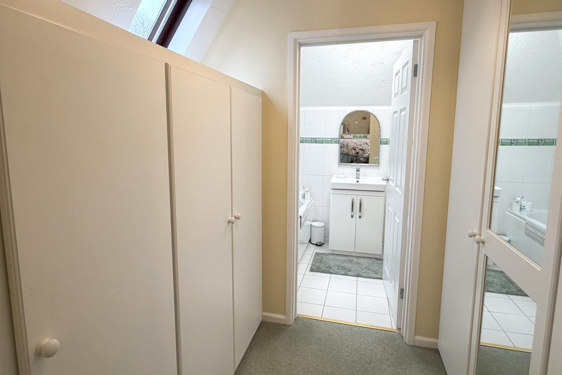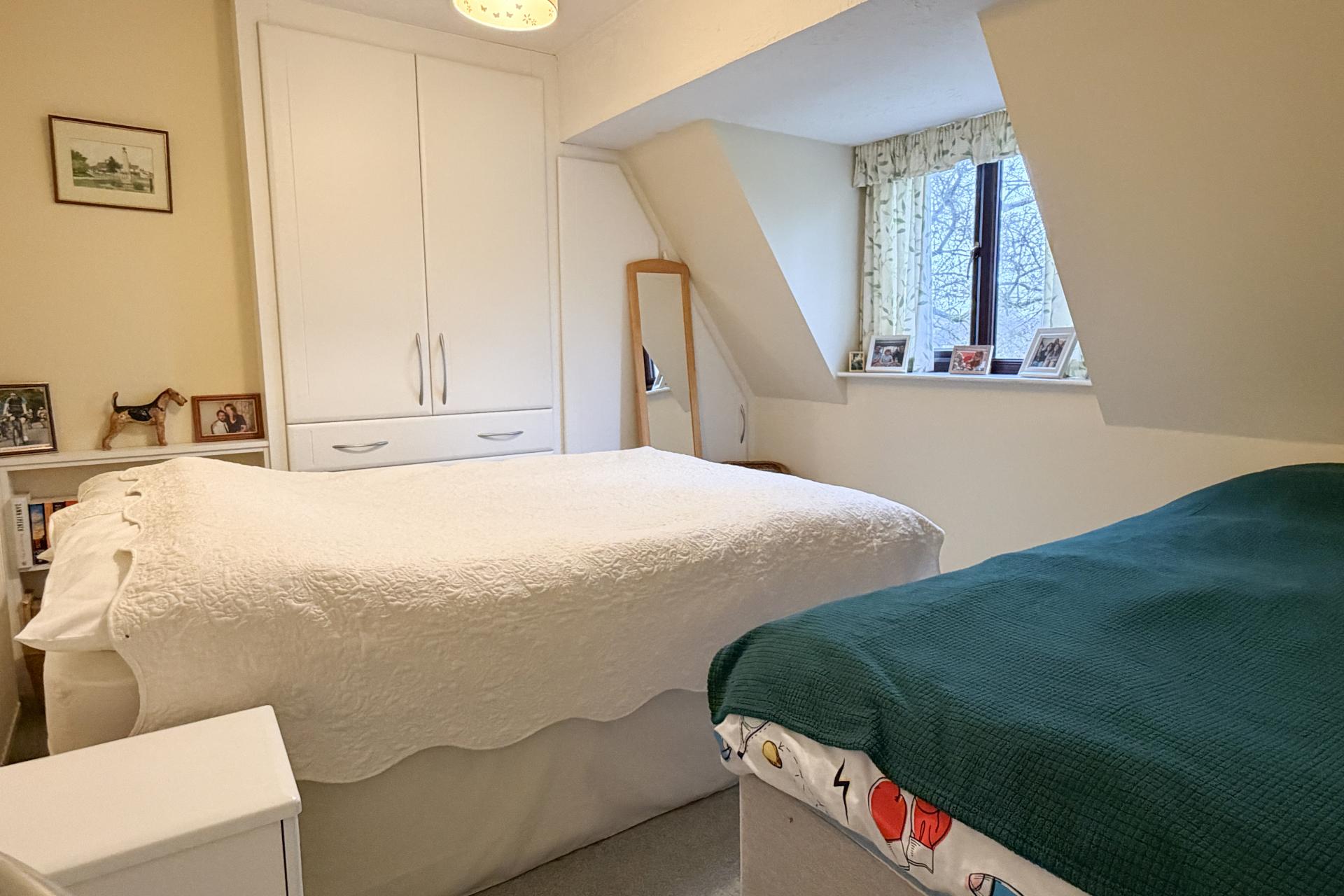 Upstairs, the landing provides access to four bedrooms. The principal bedroom is a generous double, enjoying two Velux windows overlooking the garden, together with a dressing area fitted with built-in cupboards and a private en-suite bathroom. The remaining bedrooms offer flexible accommodation, ideal for family living, guests or a home office. The family bathroom completes the first floor and is fitted with a white suite, Velux window, ladder radiator and a shower over the bath.