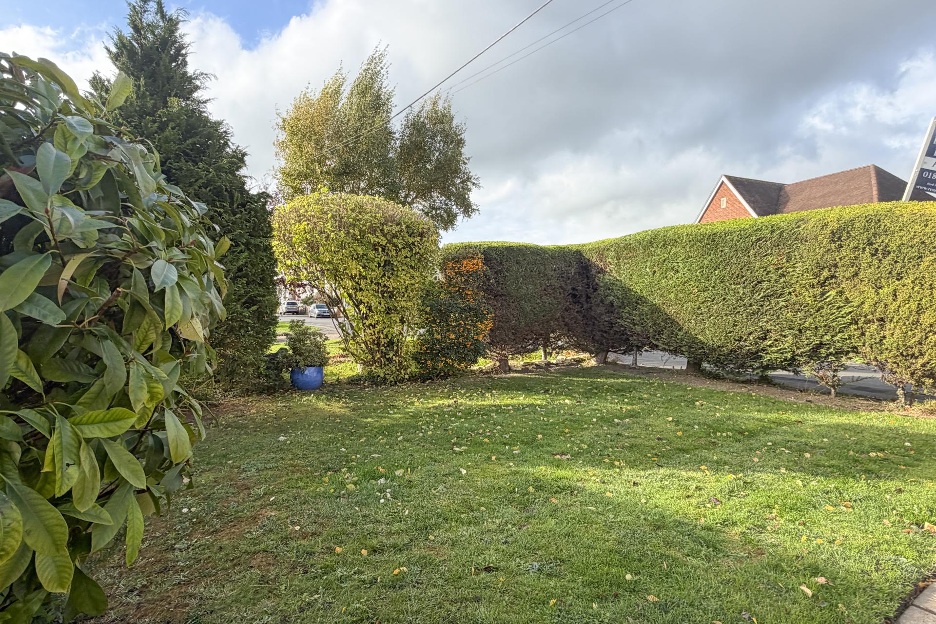 Outside, the enclosed rear garden offers a low-maintenance setting with a large, paved terrace ideal for entertaining, mature planted borders, garden lighting, and a timber shed. The front garden is mainly laid to lawn with hedgerow borders, with driveway with ample parking leading to the garage.