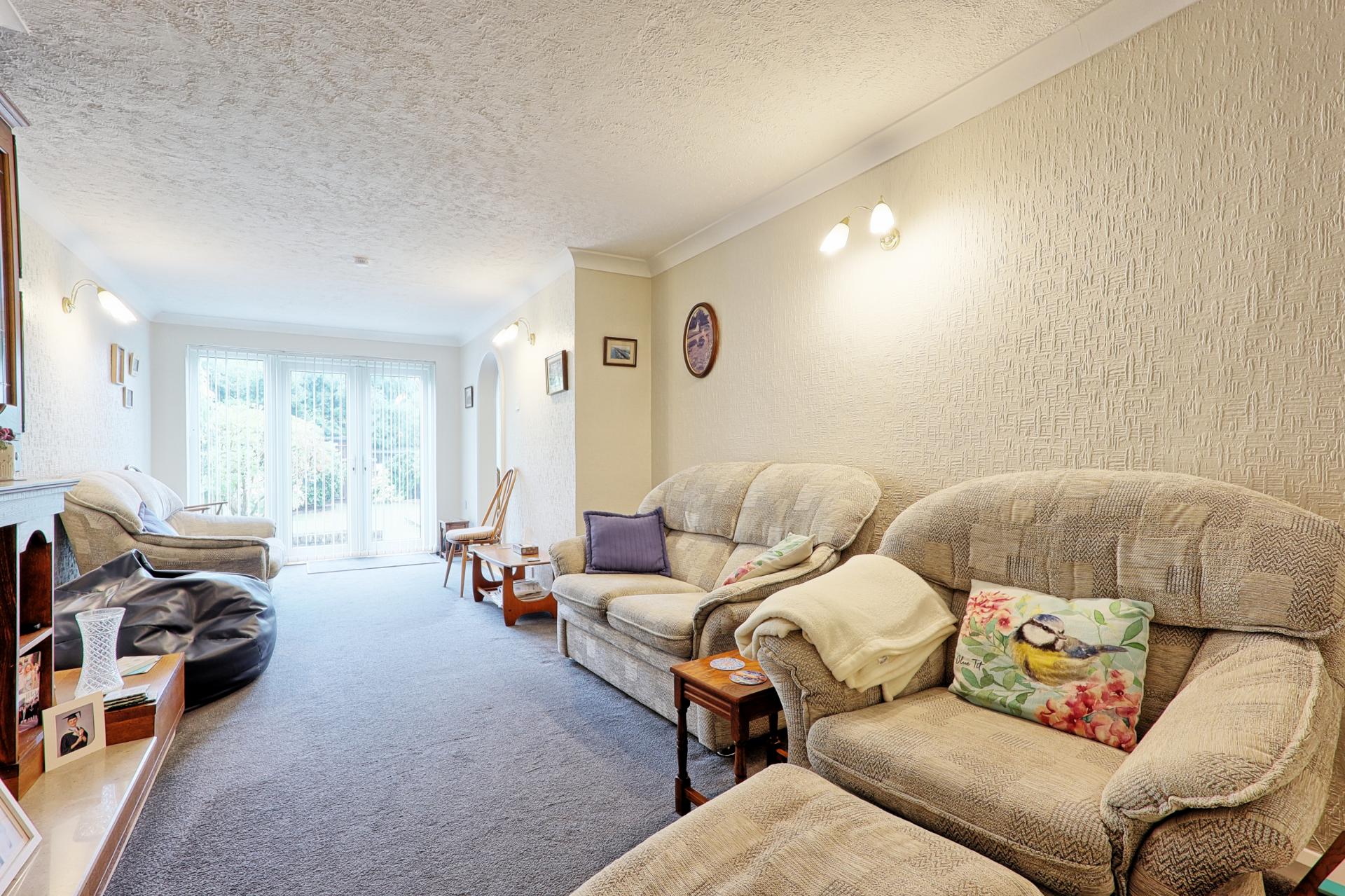 LOUNGE 24' 6" x 10' 4" (7.47m x 3.15m) Fitted with carpet and featuring a textured ceiling with coving, this comfortable space includes a radiator and an electric coal-effect fire with a mantel above. Wall lights provide ambient lighting, while double-glazed French doors with an adjacent glass side panel offer direct access to the rear garden.