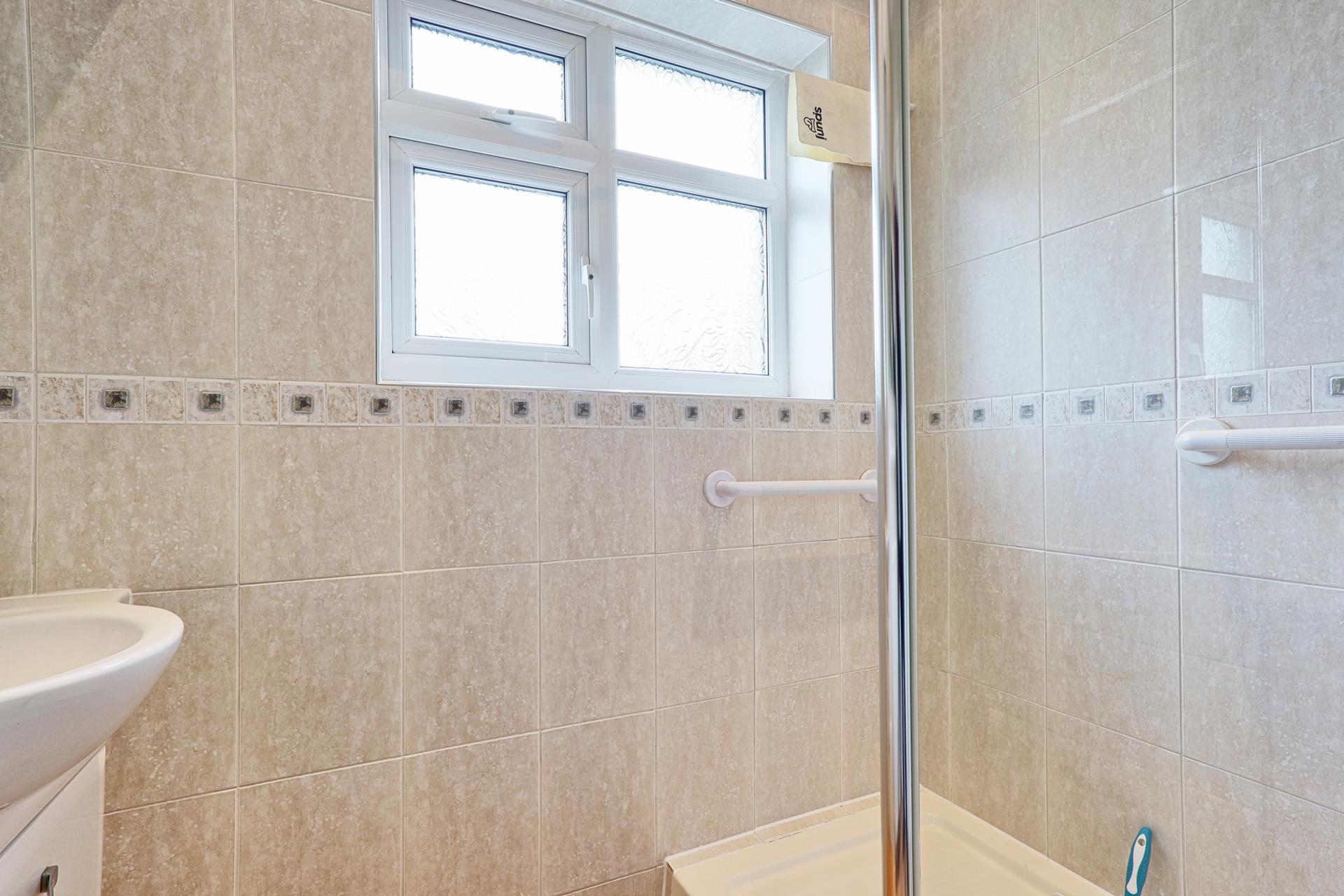BATHROOM Fitted with a two-piece suite comprising a wash hand basin inset into a vanity unit with mixer tap, and a large walk-in shower cubicle with fully tiled walls. The room features a smooth plastered ceiling with coving and inset spotlights, a radiator, extractor fan, and cushion flooring. A double-glazed opaque window to the rear provides natural light and privacy.
