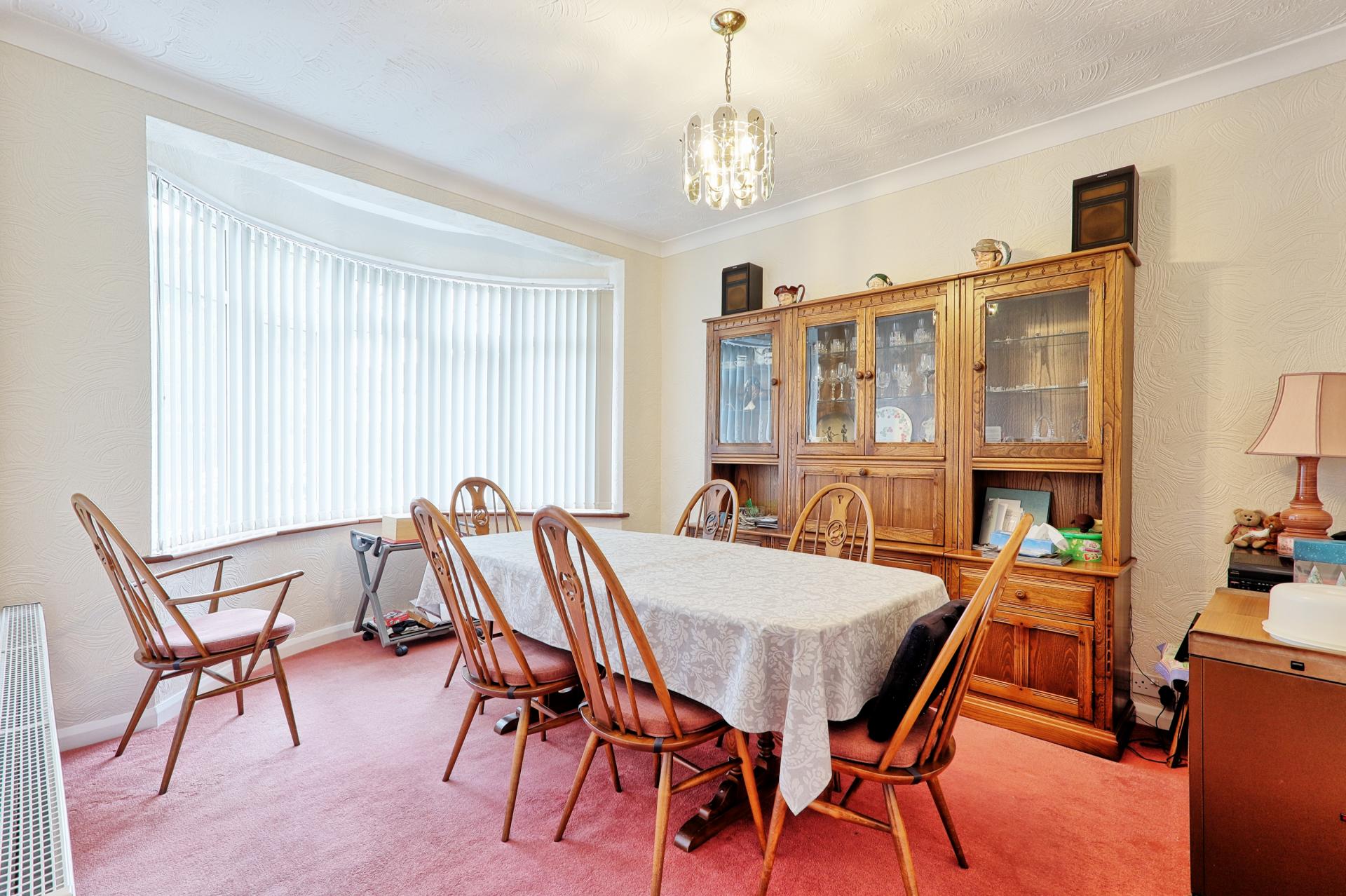 DINING ROOM 14' 5" x 11' (4.39m x 3.35m) A bright and spacious room featuring a large double-glazed leadlight bay window to the front, allowing plenty of natural light. Finished with carpet, a radiator and a textured ceiling with coving.