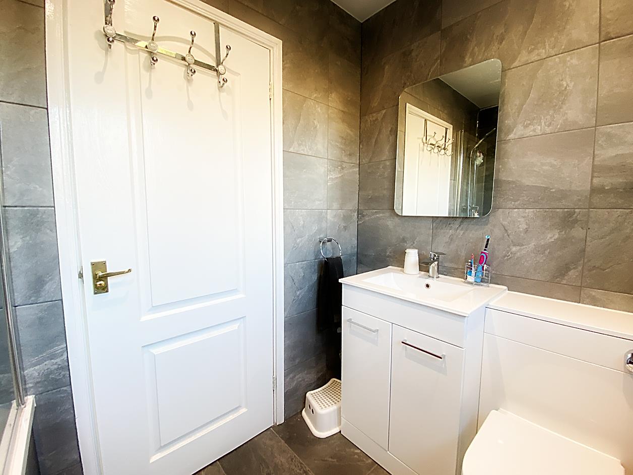 Bathroom - 2.25 x 1.64 - Comprising; bath with shower over, WC and wash hand basin with built-in furniture surrounding. Tiling to walls, double glazed window and ladder style radiator.