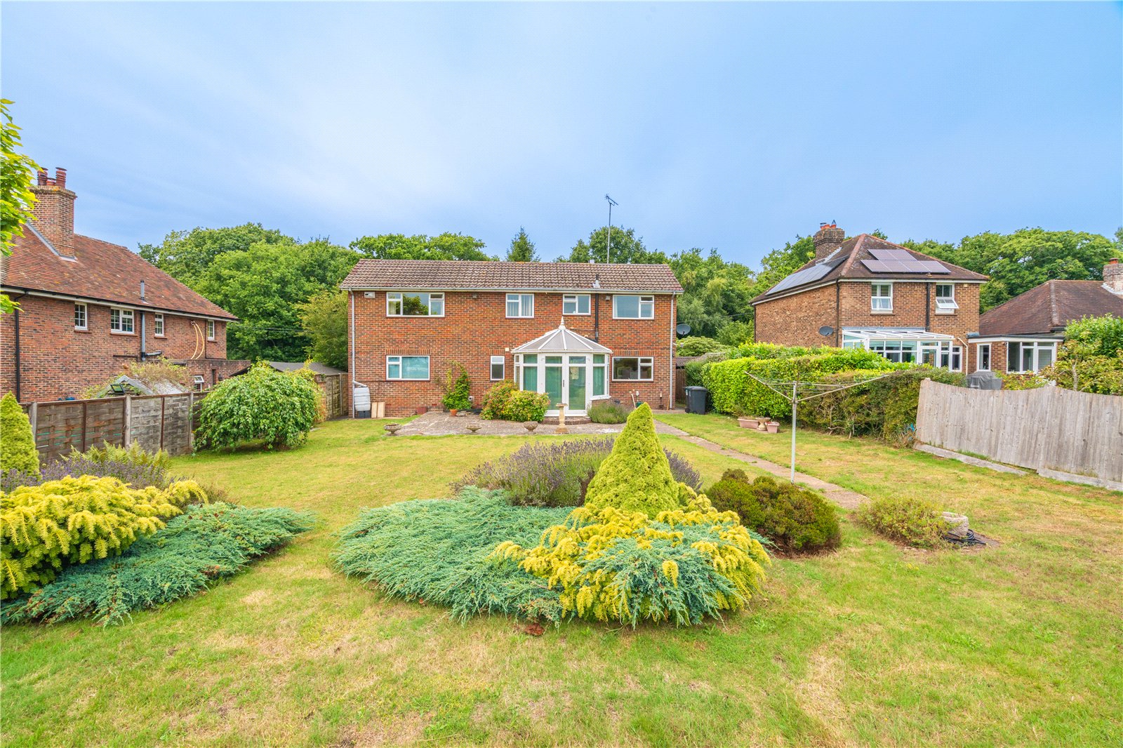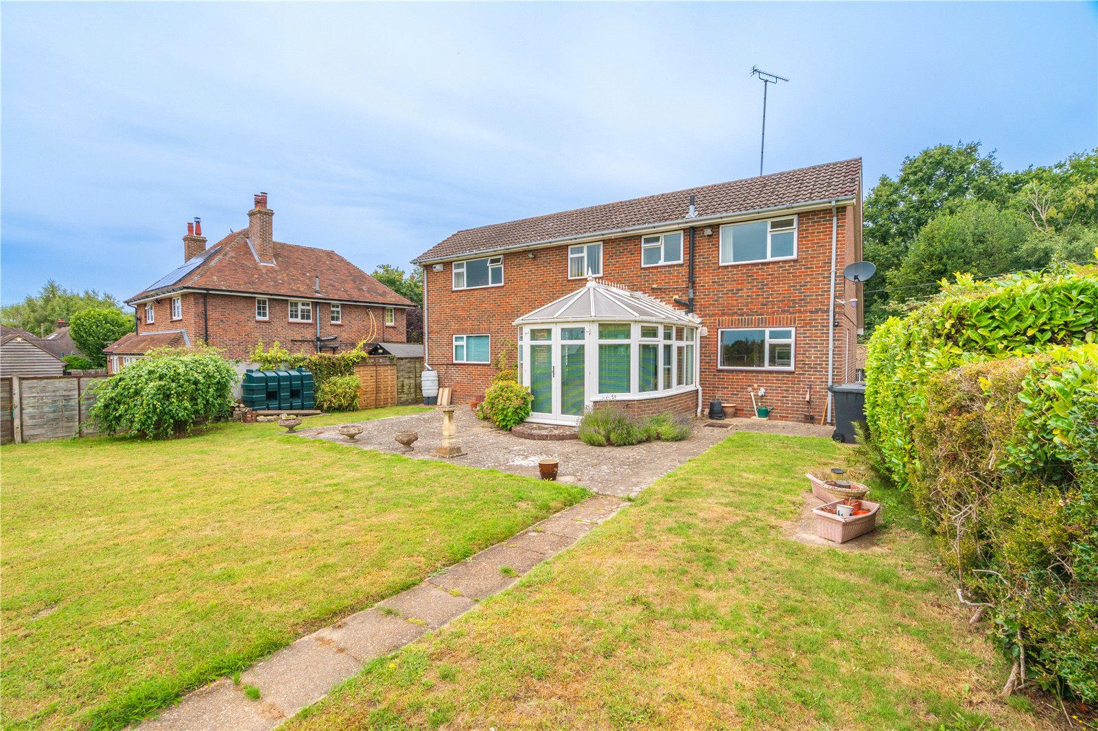 • Extensive rear garden backing onto open countryside, with mature planting, patio, greenhouse, and sheds