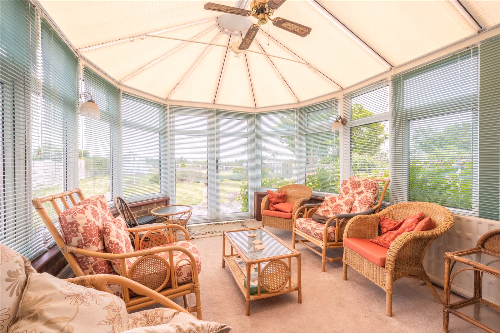FAMILY ROOM: This bright and inviting family room, set within a spacious conservatory, offers panoramic views over the garden and surrounding landscape. Featuring floor-to-ceiling windows and a glazed roof with fitted blinds, the room is flooded with natural light, creating a warm and welcoming atmosphere year-round. Double doors open directly onto the garden, enhancing the sense of connection to the outdoors. Perfect for relaxing or entertaining, this versatile space comfortably accommodates multiple seating areas and makes an ideal spot for enjoying the changing seasons.