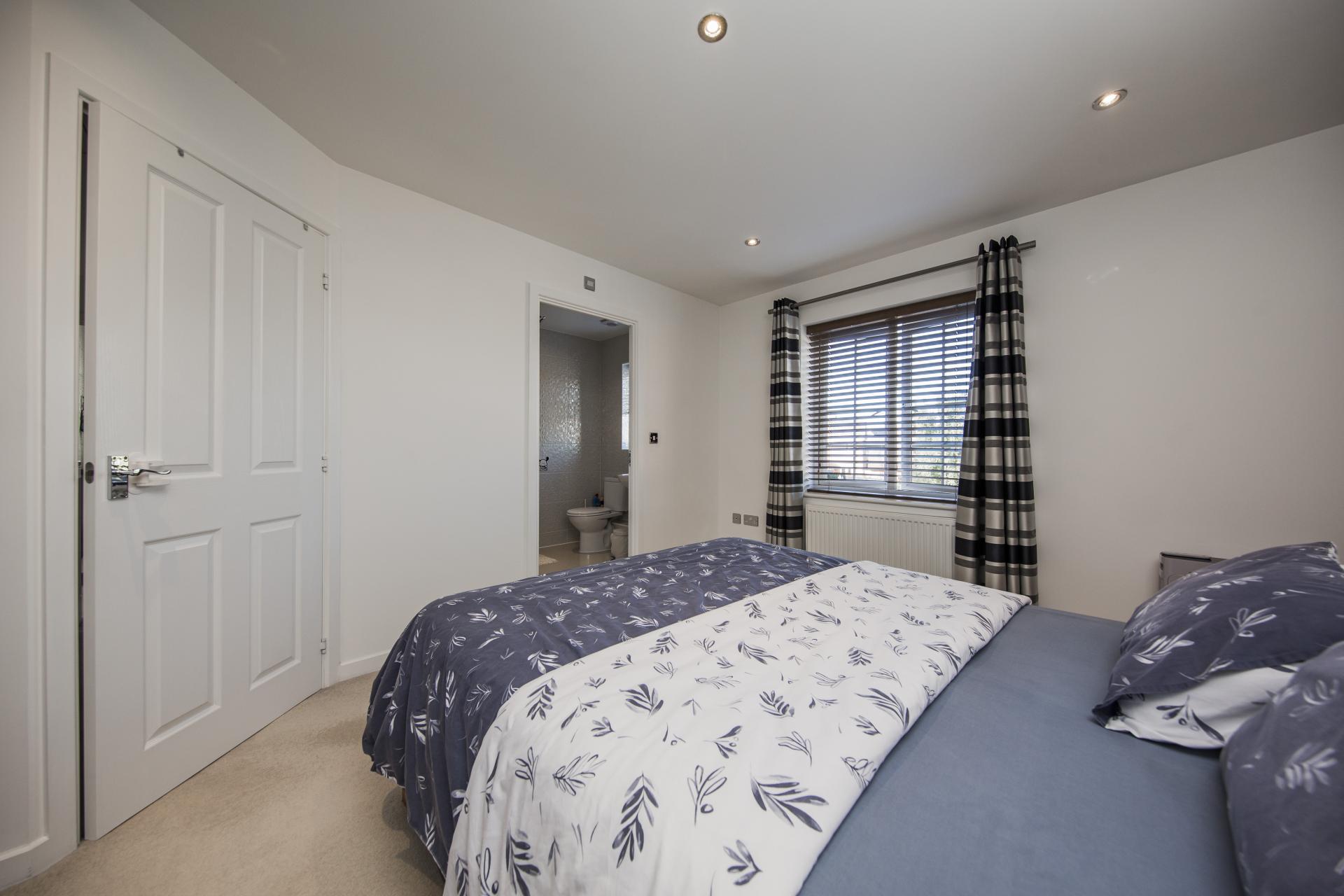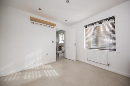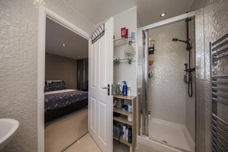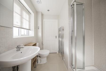 SHARED EN-SUITE SHOWER ROOM: Obscured double glazed window. Shower cubicle with electric shower. Wash basin. WC. Heated towel rail. Tiled floor. Shared access with bedroom three.