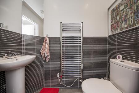 CLOAKROOM: WC. Wash basin. Heated towel rail. Electric consumer unit. Tiled flooring.