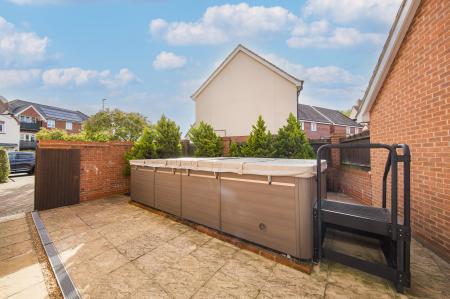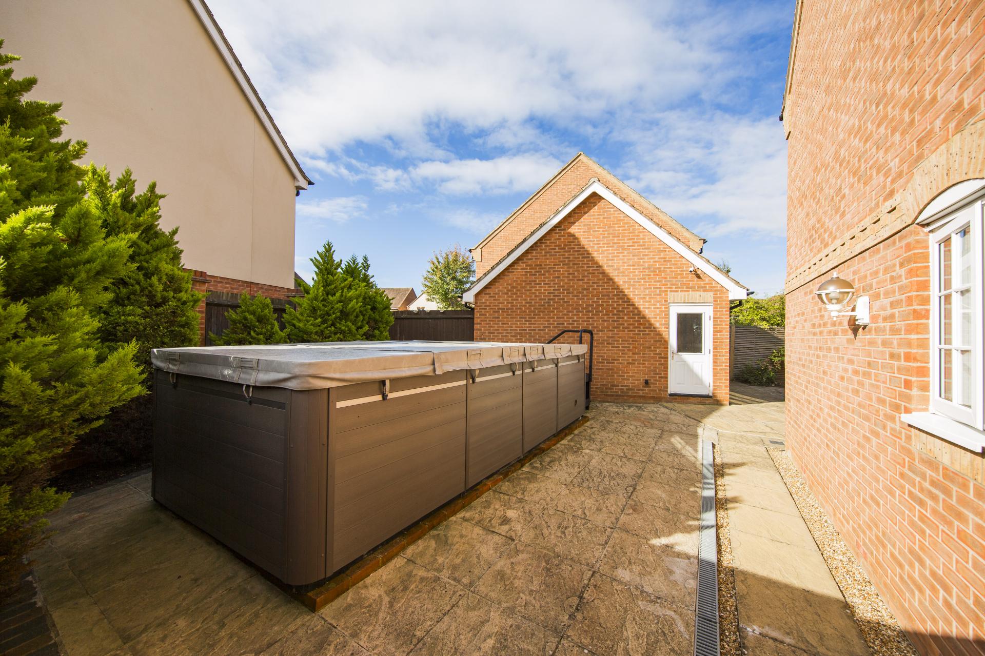 OUTSIDE: To the FRONT of the property is a patio area plus driveway with an EV charge point and parking for two cars. The driveway gives access to a single garage with up-and-over door and personal door to the rear garden. To the REAR is a patio garden with shrub borders, side gate and large 'Hydropool' heated spa swimming pool.