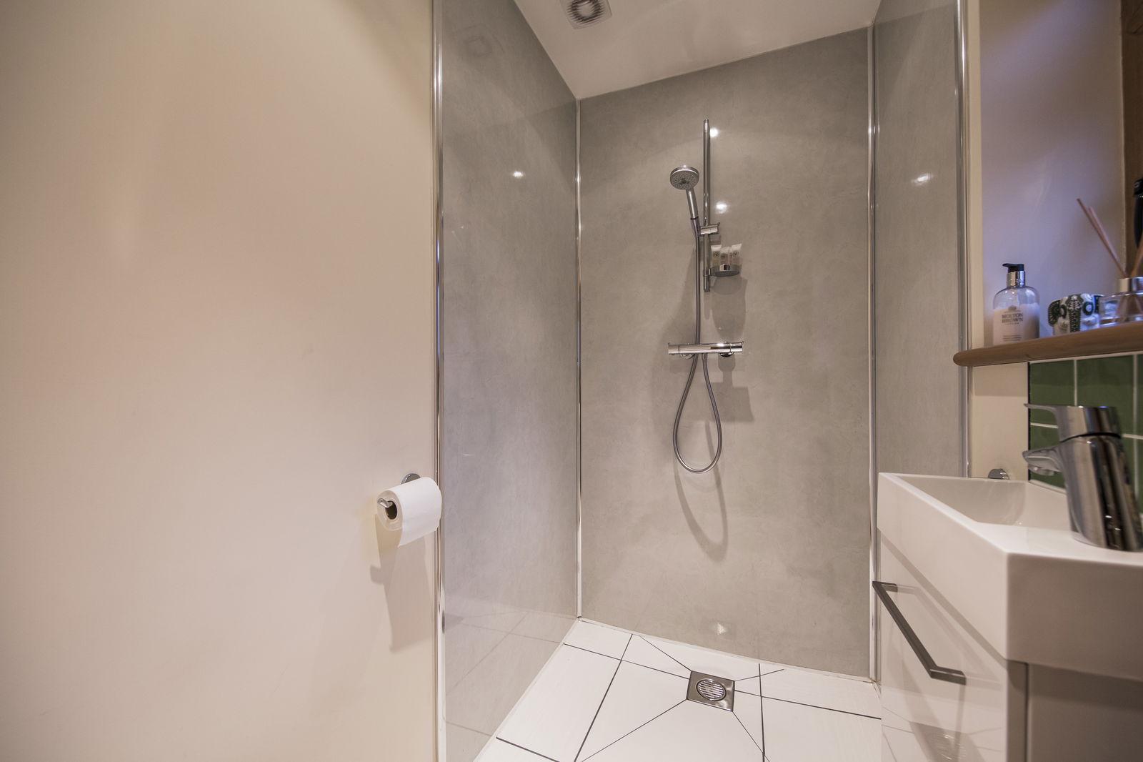 EN-SUITE SHOWER ROOM: Obscure double glazed Velux window to ceiling. White contemporary suite with chrome effect fitments comprising low-level WC, rectangular wide wash basin with cupboard below housing shaver point and mixer tap and tiled splash back over. Ceramic tiled flooring opening wet room style into a large twin-headed shower system. Recessed ceiling downlighters and door to useful shelved cupboard.