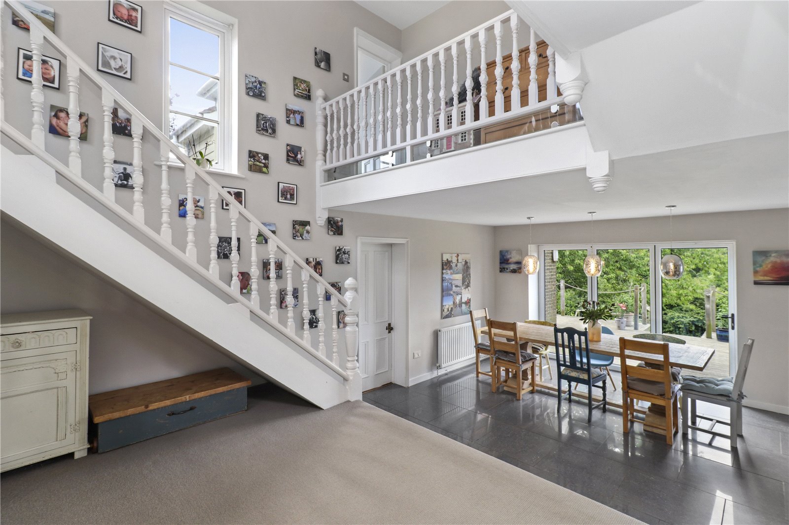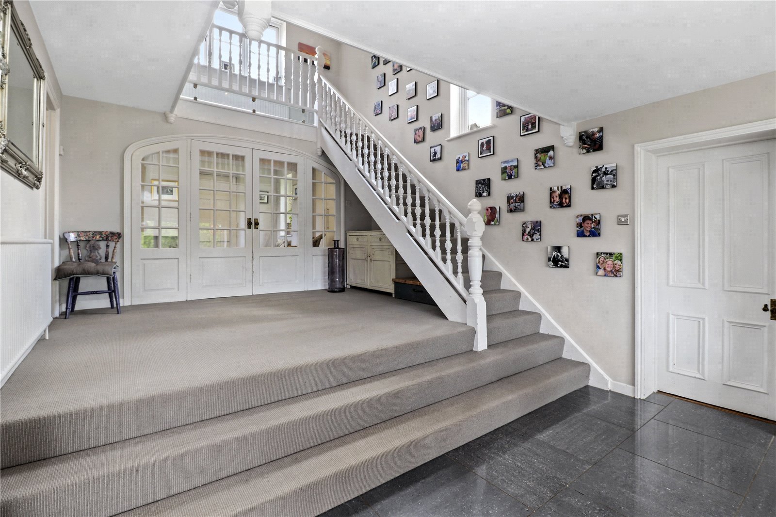 MAIN FRONT RECEPTION HALL: With the initial front section arranged with polished ceramic tiled flooring, twin modern bespoke fitted coats and storage cupboards either side, twin paned double glazed windows also mirrored either side, down lights, elegant paned glazed and panelled double doors and matching sides that open and lead you further into the large open plan galleried reception hall with feature vaulted ceilings, radiator, feature ceiling lights and wide steps leading to the vast open plan kitchen / breakfast room / dining room areas beyond.