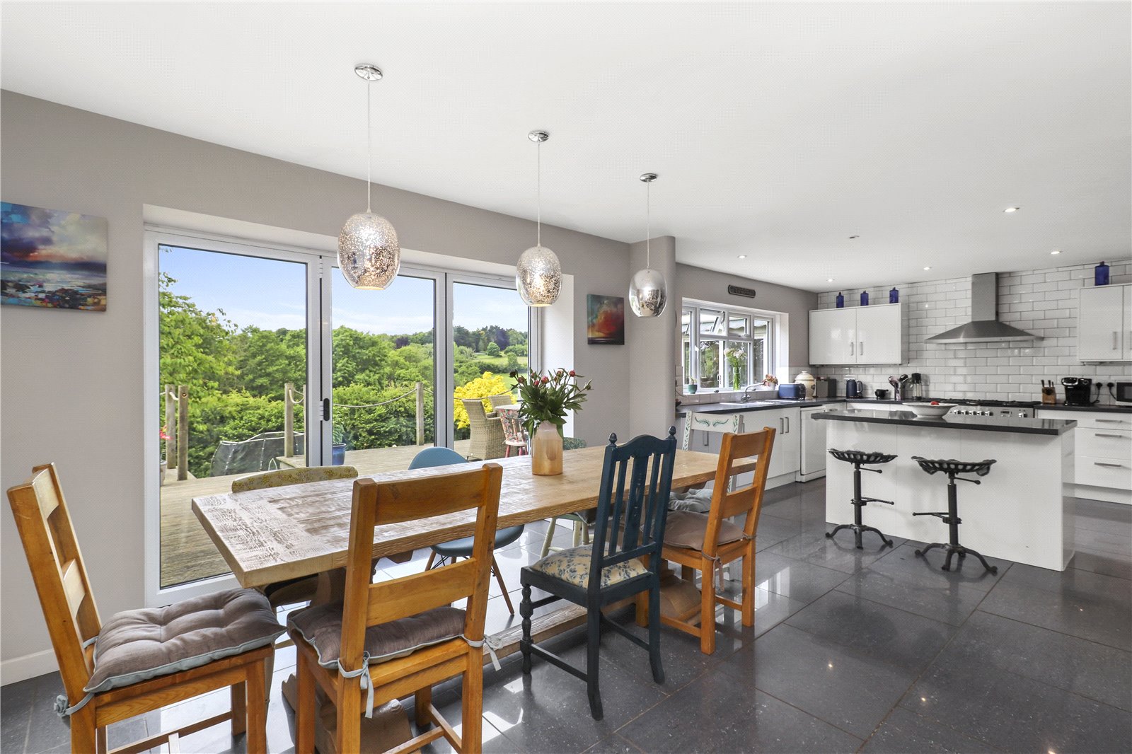 OPEN PLAN ADJOINING DINING ROOM: With central dining area with feature lighting above, polished ceramic tiled floor, radiator, large full height double glazed bi folding doors opening onto the rear alfresco decked dining area with far reaching views of the countryside beyond.