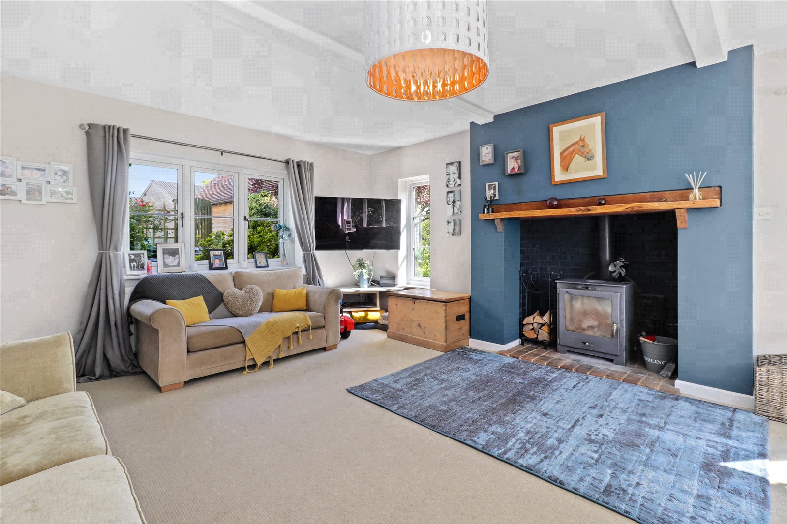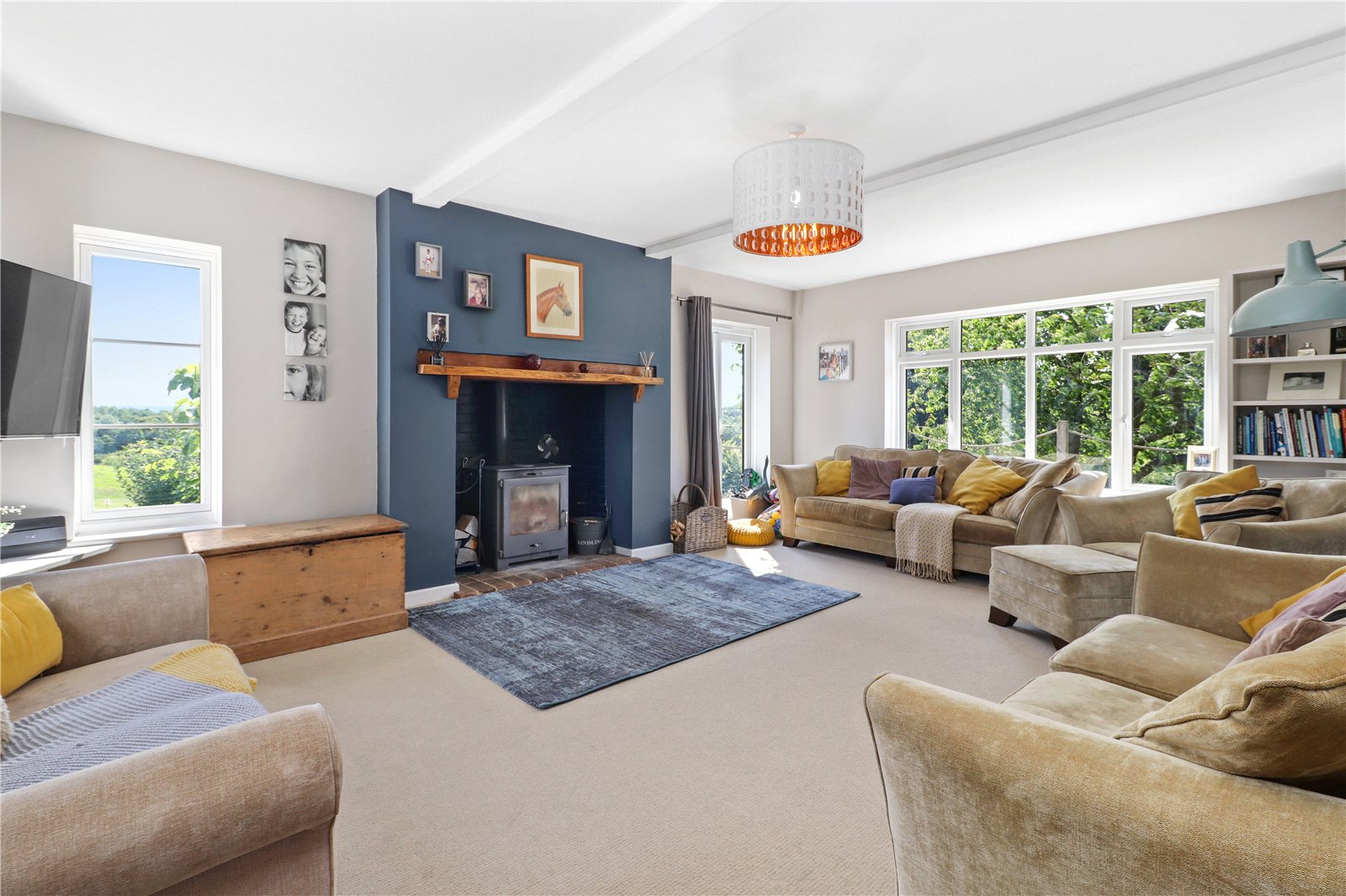 LOUNGE: Approached from the open dining room and being a light triple aspect room with a beautiful feature fireplace with a brick hearth and fitted with a wood burner and having a bressummer beam over, double glazed window with aspect over the front and further double glazed window with aspect over the side grounds, French doors leading onto side and rear decked sun terrace, as well as double glazed windows also enjoying a pleasant aspect over the rear gardens and beyond of the adjoining countryside.