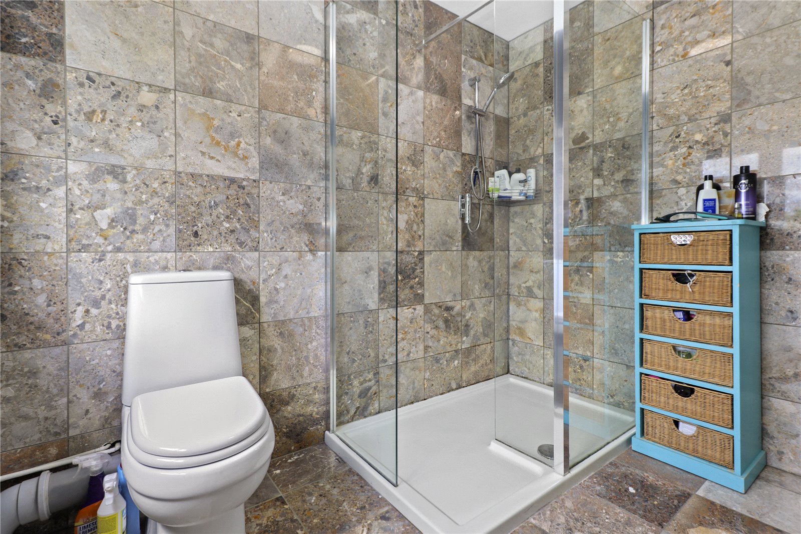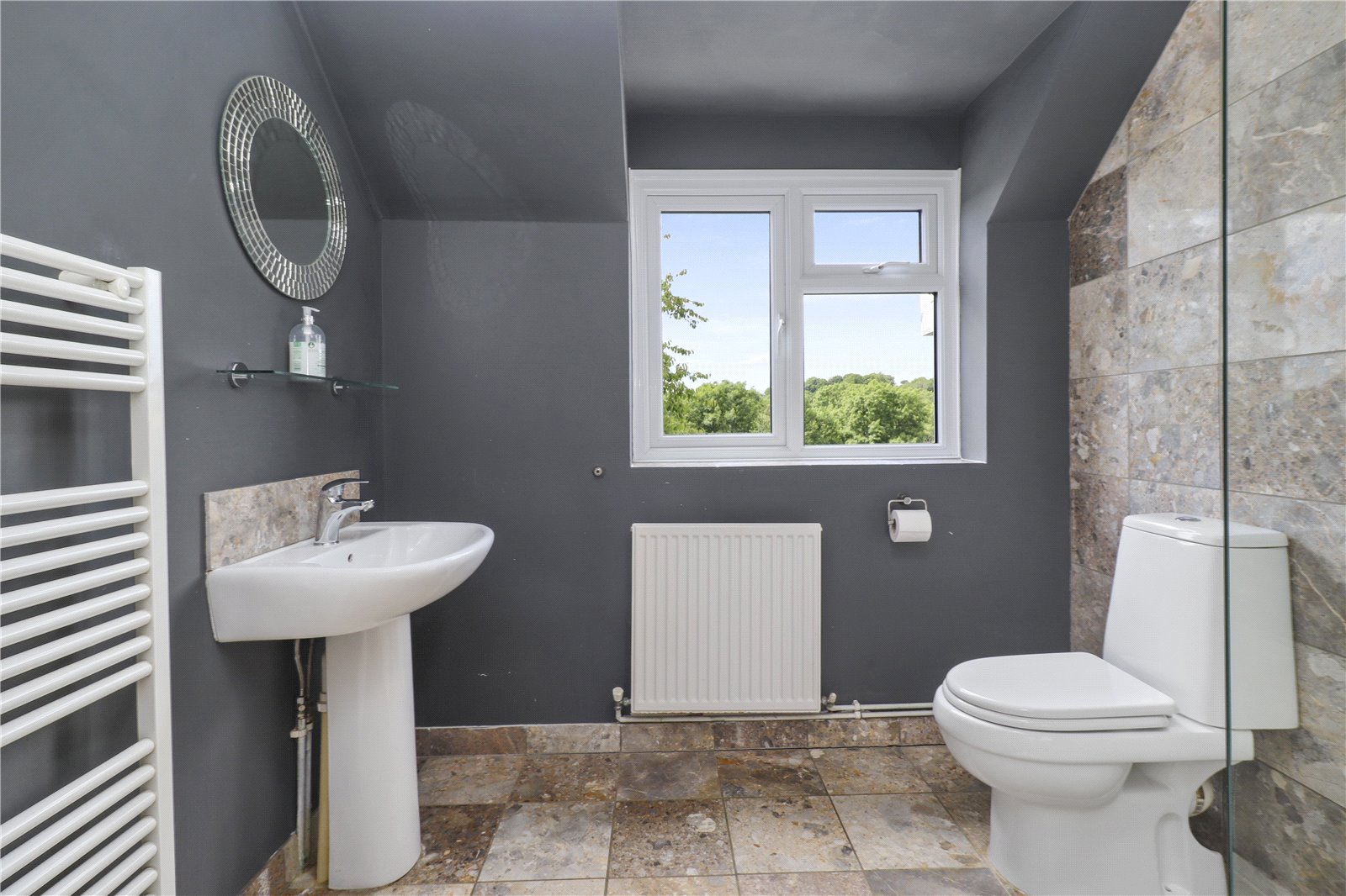 ENSUITE LUXURY SHOWER ROOM TO BEDROOM ONE: With marble tiled floor and walls, pedestal wash basin with chrome mixer tap and marble tiled splashback, heated towel rail, W.C., double sized heavy glazed fronted shower with marble tiled walls and chrome shower control system, radiator, double glazed window with aspect over the rear gardens and benefitting also from stunning far-reaching views beyond.
