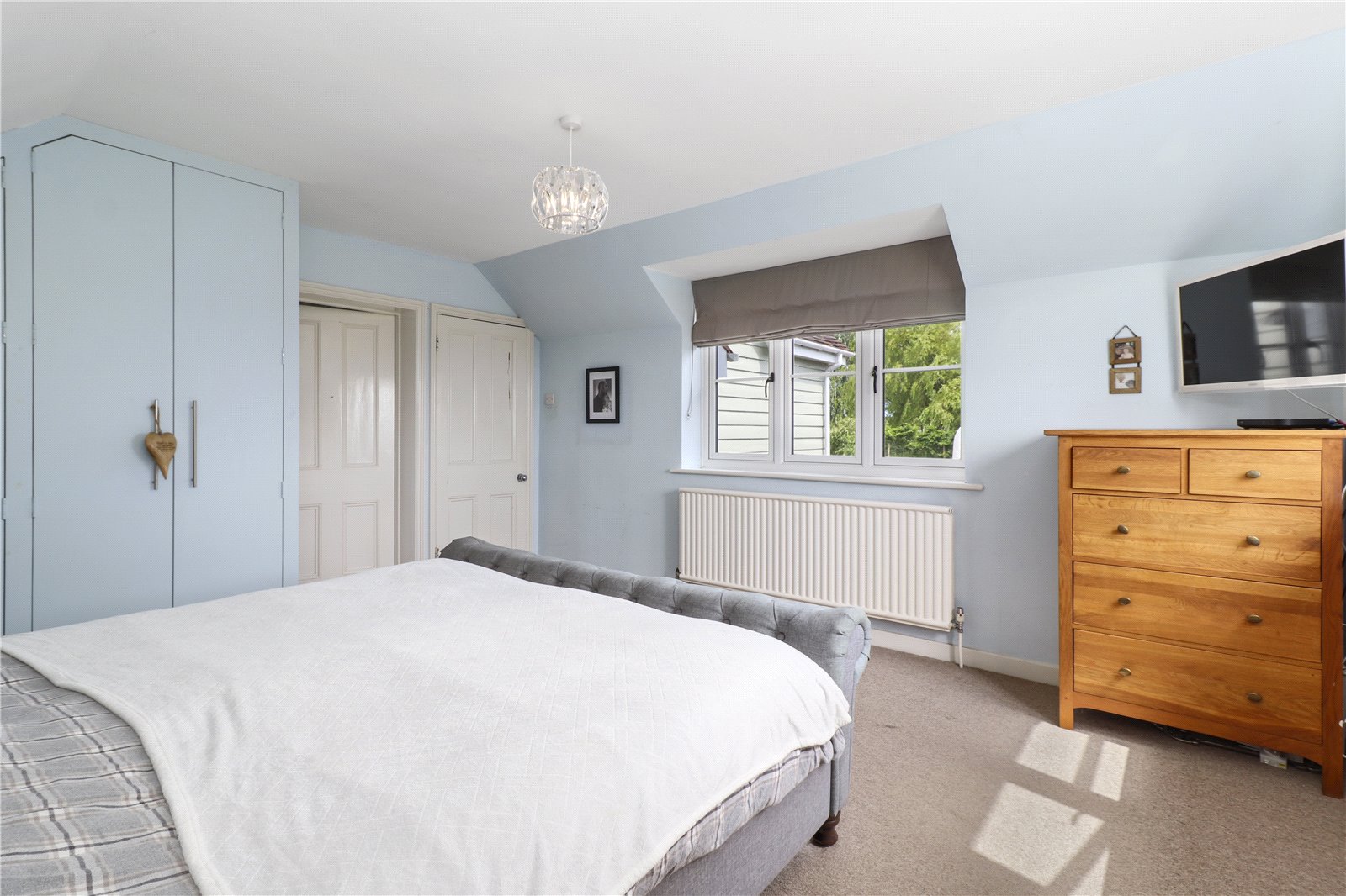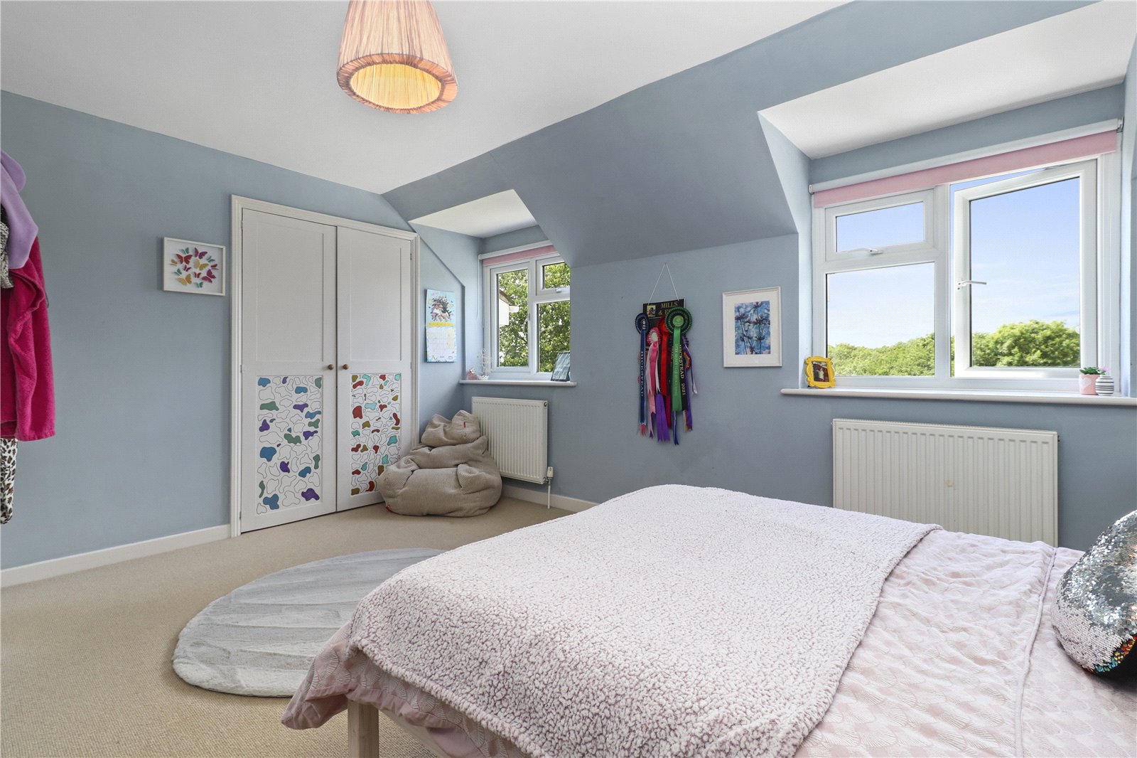 BEDROOM THREE: A double sized room with radiator, fitted wardrobe cupboards and double-glazed windows with pleasant aspect over the front gardens and grounds and beyond of the beautiful adjoining countryside.