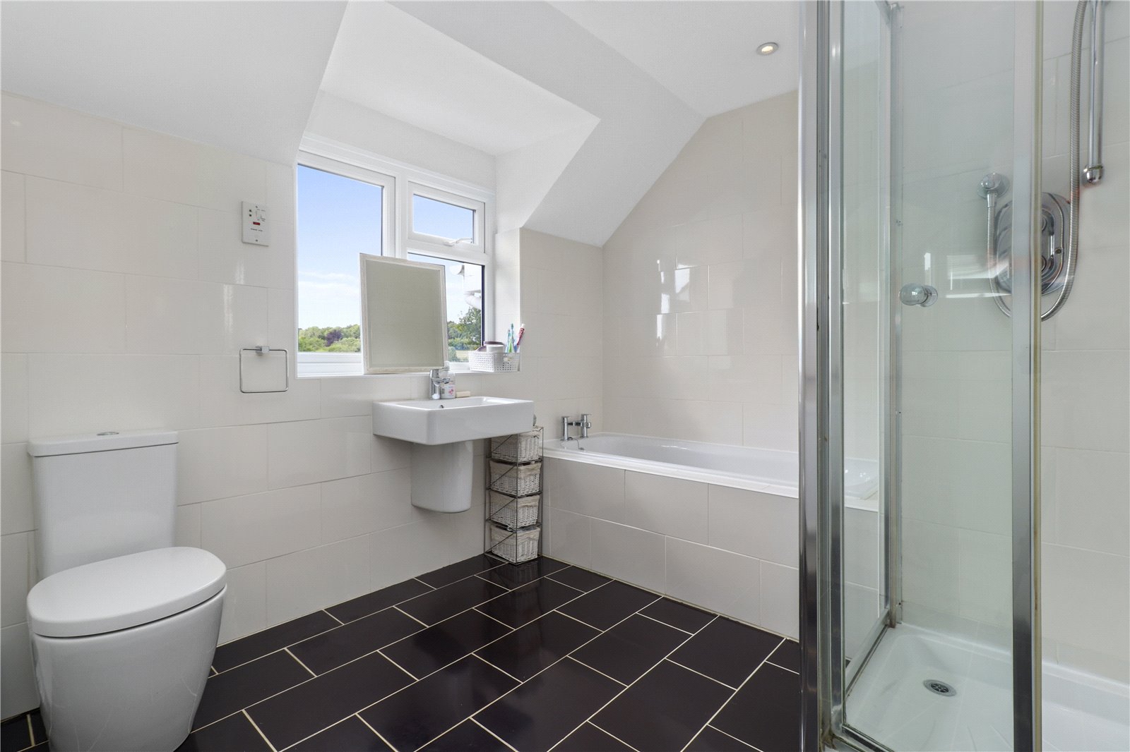 FAMILY BATHROOM / SHOWER ROOM: Comprising of tiled floors, fitted bath with tiled sides and surrounds, W.C., feature wall mounted wash basin, separate shower cubicle with glazed and chrome bi folding front door, tiled walls and shower control system, radiator, tiled walls, double glazed window with aspect over the rear gardens and beyond of the adjoining countryside.