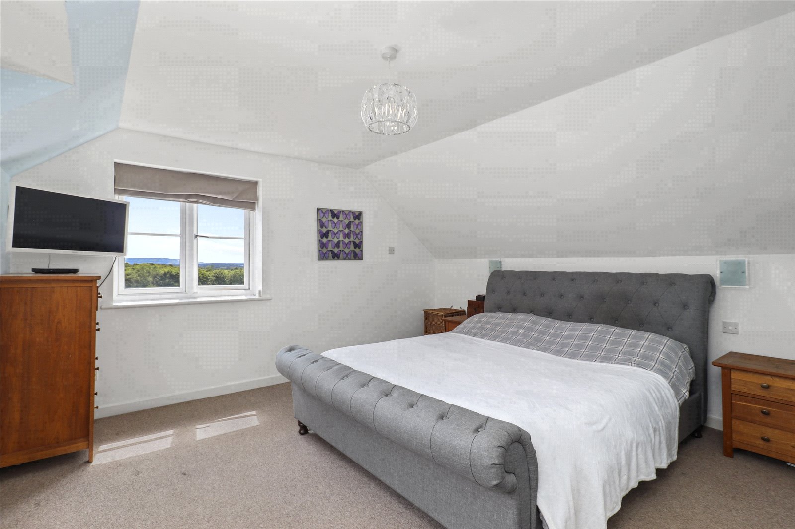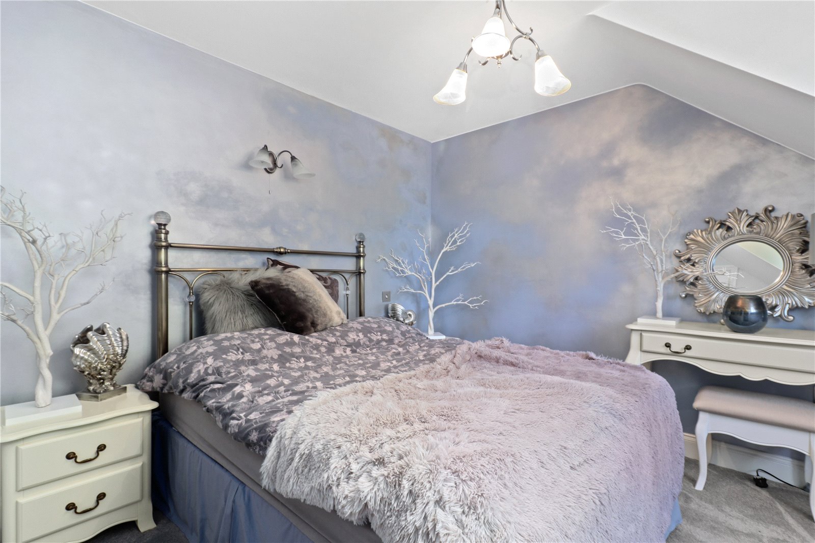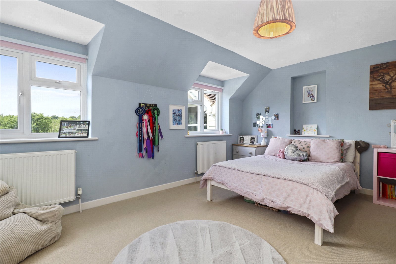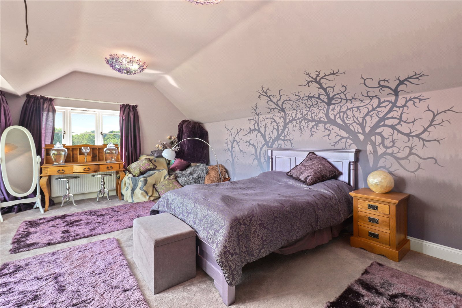 MAIN BEDROOM ONE SUITE WITH ENSUITE LUXURY SHOWER ROOM: Comprising of a double sized double aspect bedroom with feature ceiling light, fitted wardrobe cupboards, radiator, double glazed window with aspect to front gardens and views beyond of the adjoining countryside, further double-glazed window with aspect to the side gardens and grounds with stunning far reaching rural views beyond. Door leading to the luxury ensuite shower room.