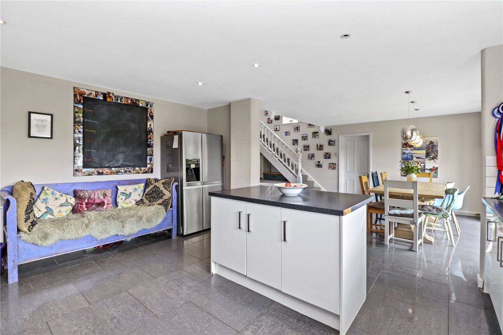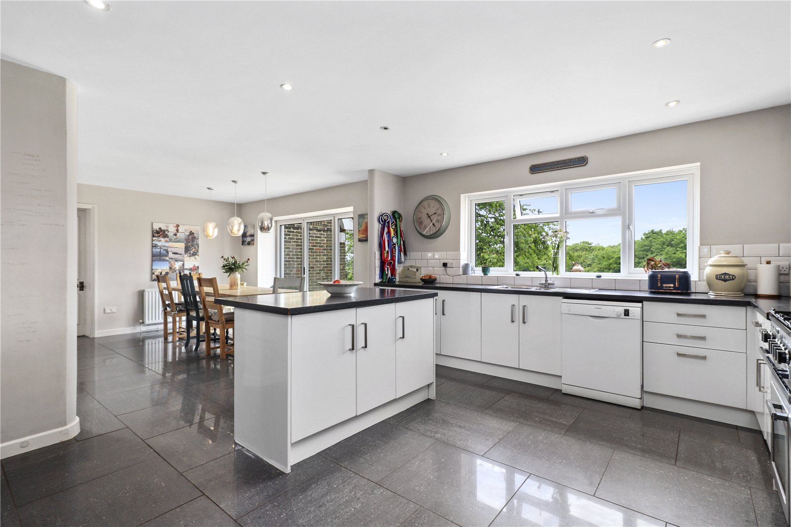 LARGE OPEN PLAN KITCHEN / BREAKFAST ROOM / DINING ROOM: With impressive polished ceramic tiled floors, downlighting.