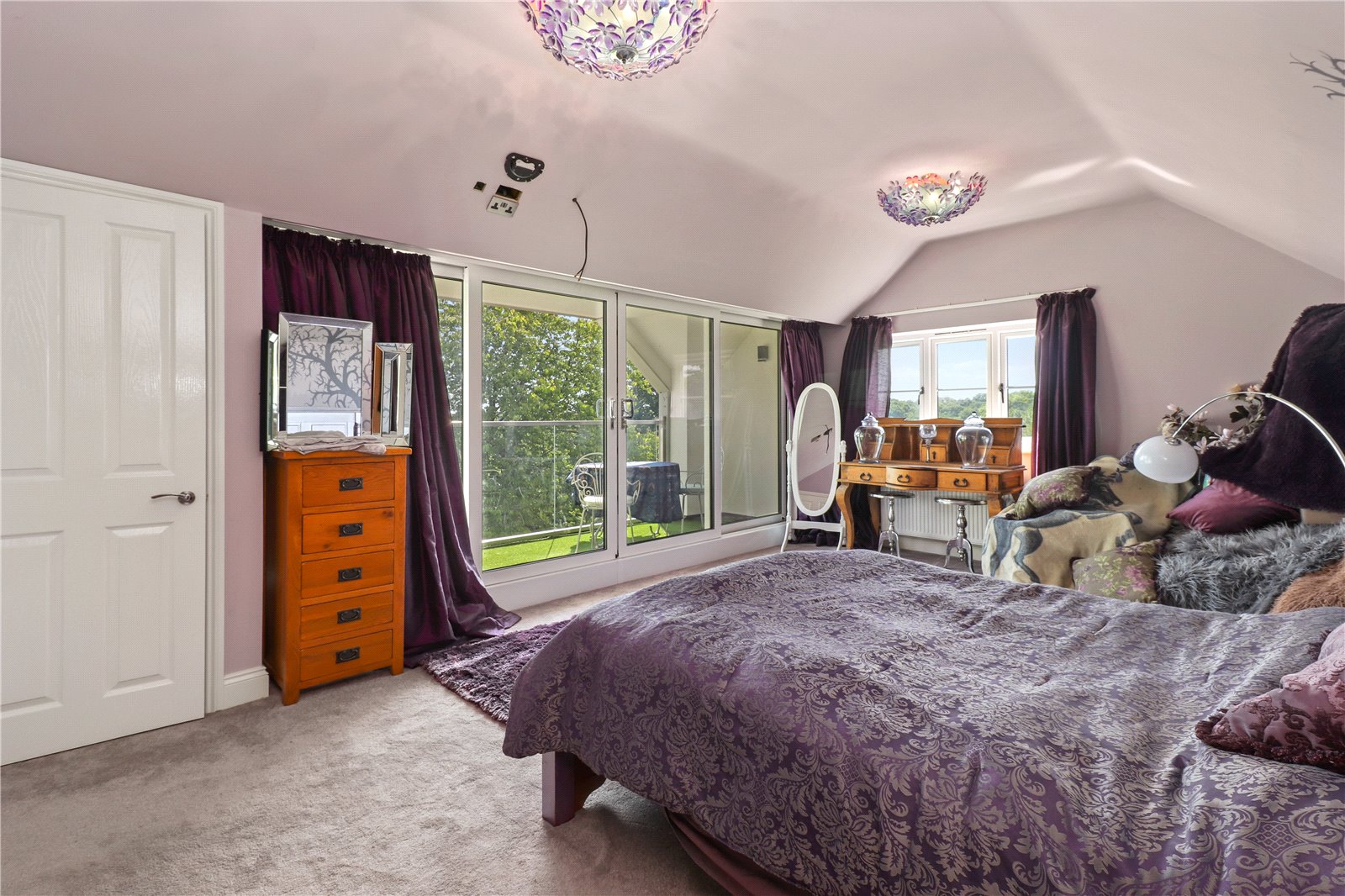 ANCILLARY ACCOMODATION BEDROOM ONE: A double sized double aspect room with vaulted ceiling, radiator, recessed area for wardrobes, double glazed sliding doors to the side covered exterior balcony. This balcony has a heavy glazed front and ample space for a table and chairs to enjoying morning coffees and evening drinks, whilst enjoying the stunning panoramic rural views.