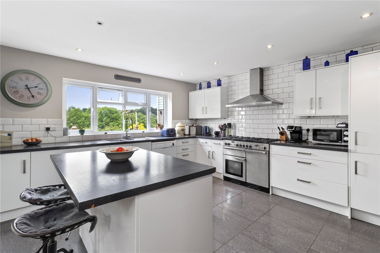 OPEN PLAN KITCHEN / BREAKFAST ROOM: With an extensive range of high gloss Italian style cupboard and base units with worksurfaces over, fitted sink unit with drainer and mixer tap, tiled surrounds, space for gas cooking range with brushed steel air purifier hood over, space for dishwasher, space for large American fridge freezer, radiator, central breakfast bar / preparation island with matching high gloss base units and marble style surface over, double glazed windows with far reaching aspect over the gardens and adjoining countryside beyond, door leading to adjoining utility room.