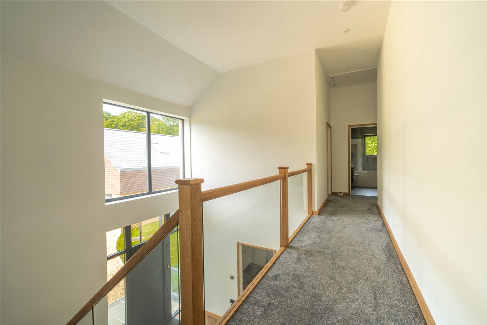 BEDROOM 2: This generously sized double bedroom is bathed in natural light, thanks to its striking corner window feature which frames far-reaching views across the surrounding countryside. Finished with soft carpeting, neutral décor, and oak detailing, it provides a calm and elegant retreat.