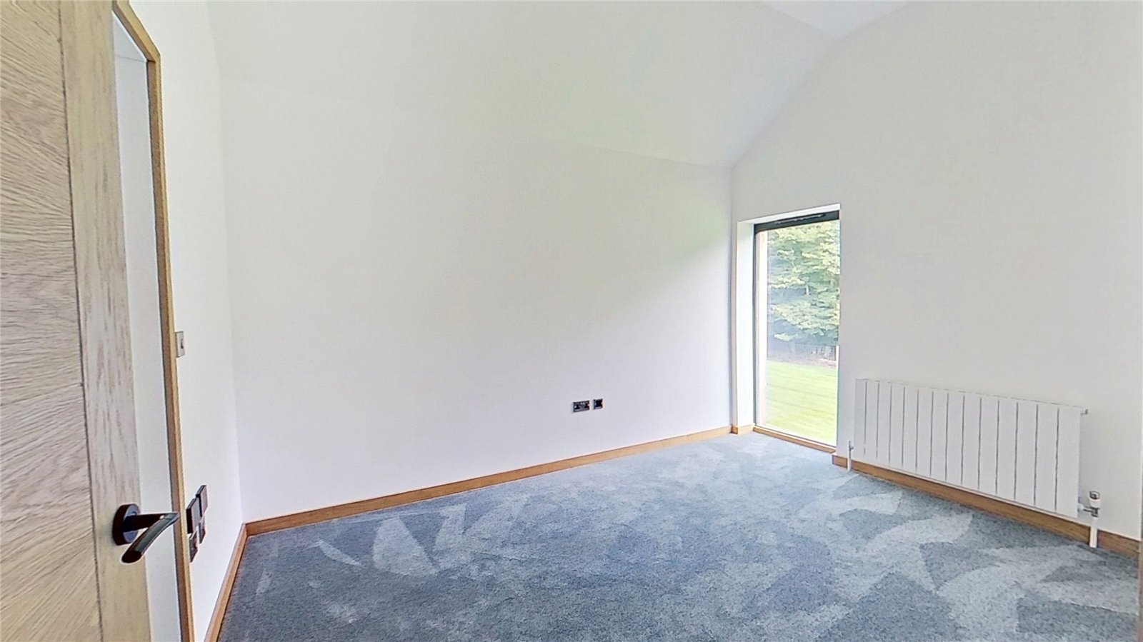 BEDROOM 3: A generously sized bedroom with a vaulted ceiling and a full-height picture window that frames views across the gardens, filling the space with natural light. The room is finished in a soft neutral palette with plush carpeting and a contemporary radiator, offering both comfort and style. Its clean, modern design provides a versatile canvas for a guest room, children’s bedroom, or private retreat.