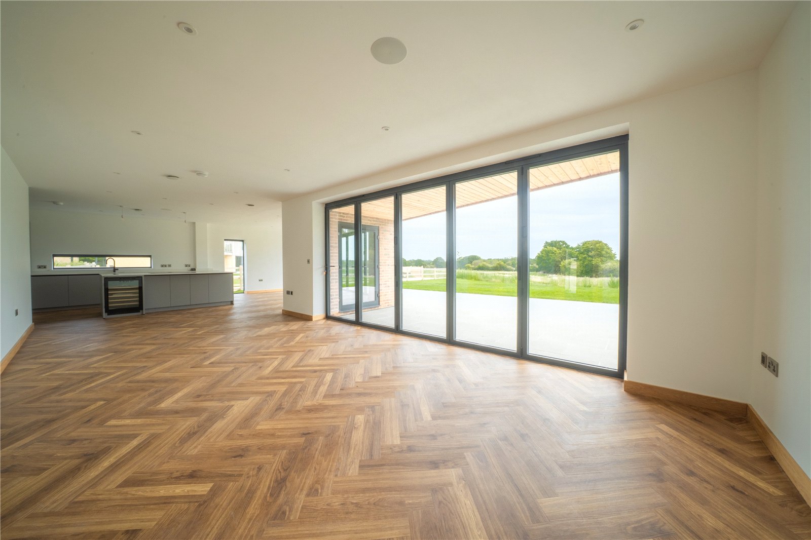 OPEN PLAN KITCHEN/DINING ROOM/LIVING ROOM: This impressive open plan space forms the heart of the home, designed to maximise light and flow. Expansive floor-to-ceiling sliding doors frame stunning views across the landscaped gardens and open countryside beyond, while seamlessly connecting the interior with the large patio terrace – perfect for indoor-outdoor living.