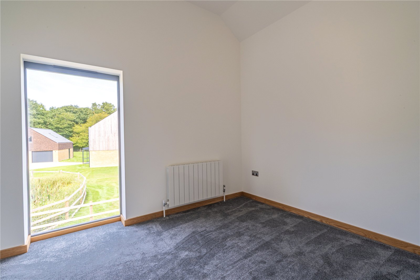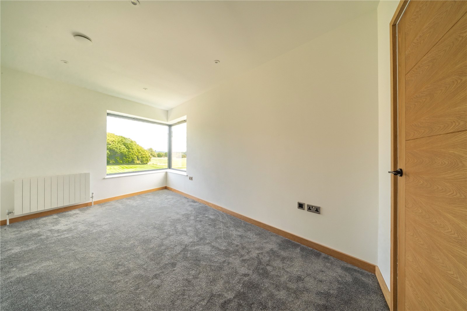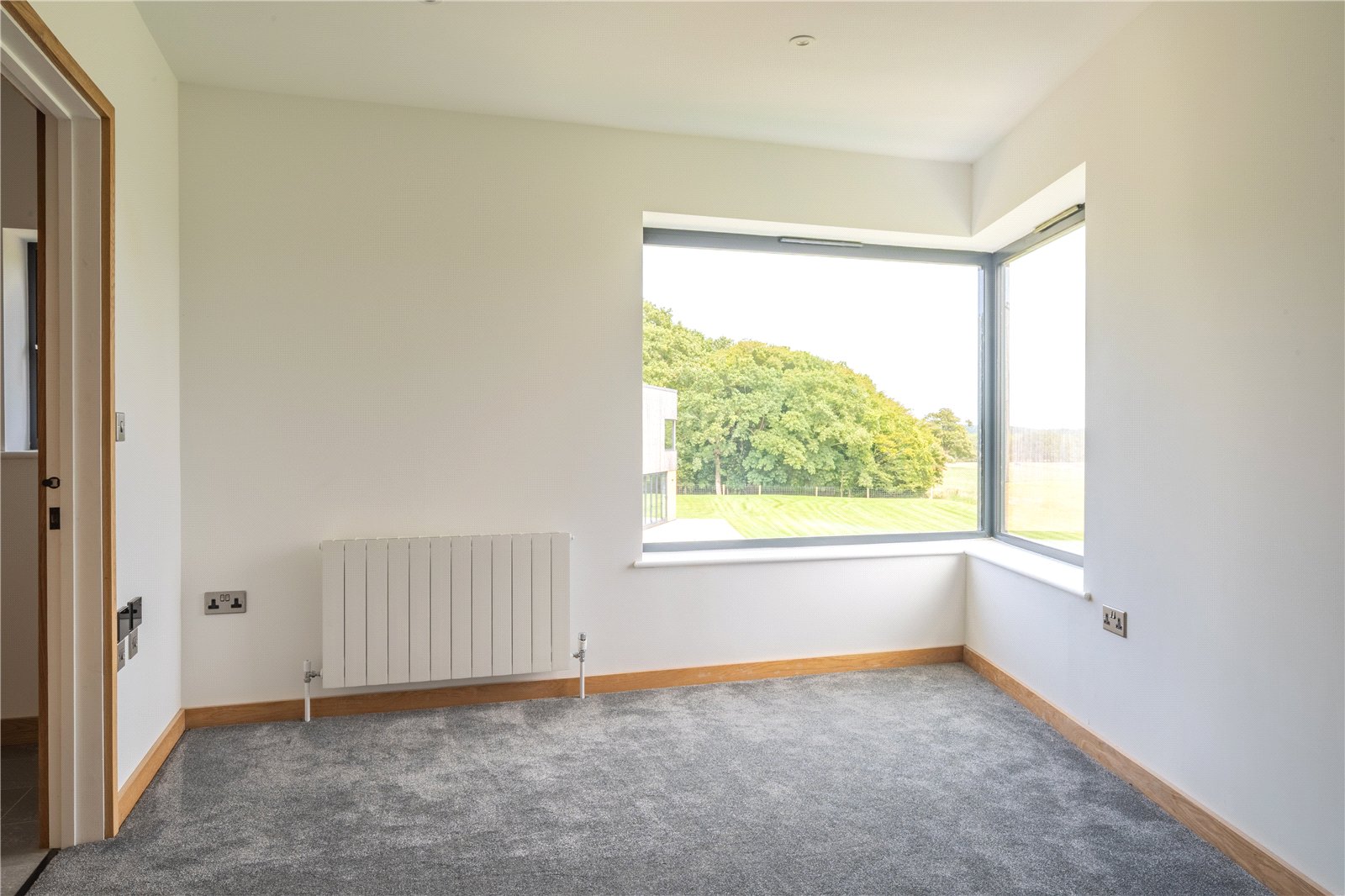 BEDROOM 2: This generously sized double bedroom is bathed in natural light, thanks to its striking corner window feature which frames far-reaching views across the surrounding countryside. Finished with soft carpeting, neutral décor, and oak detailing, it provides a calm and elegant retreat.