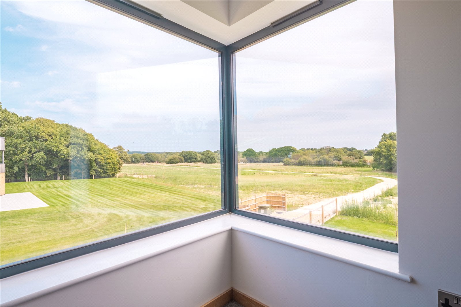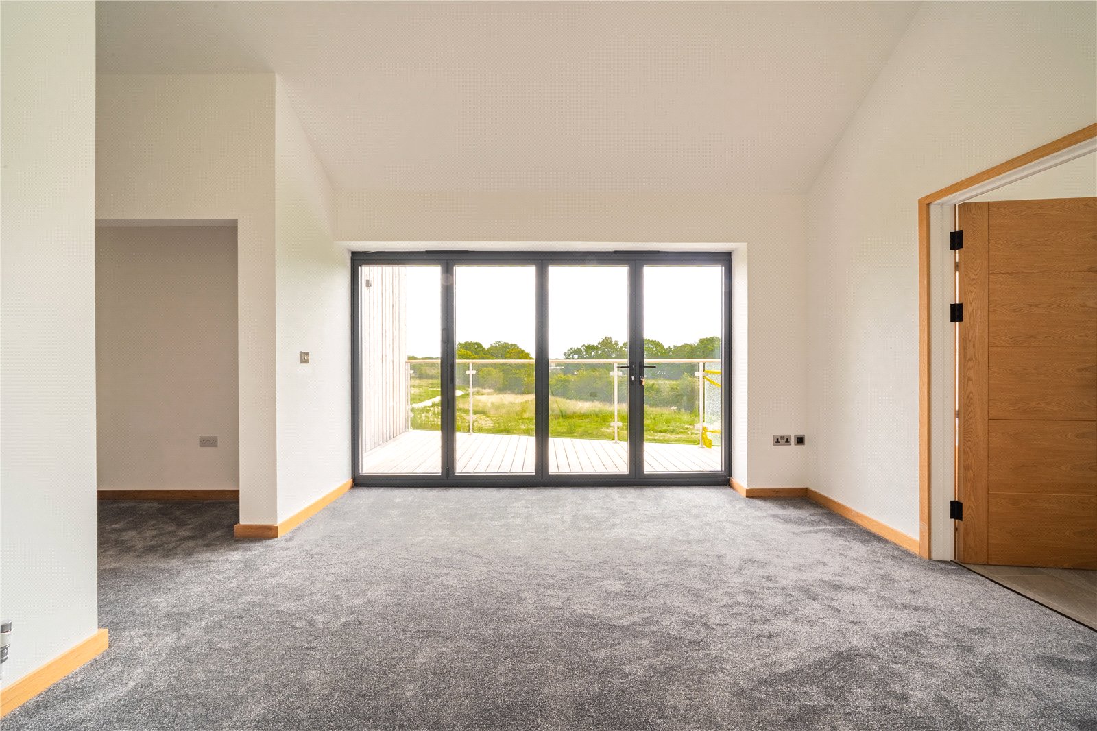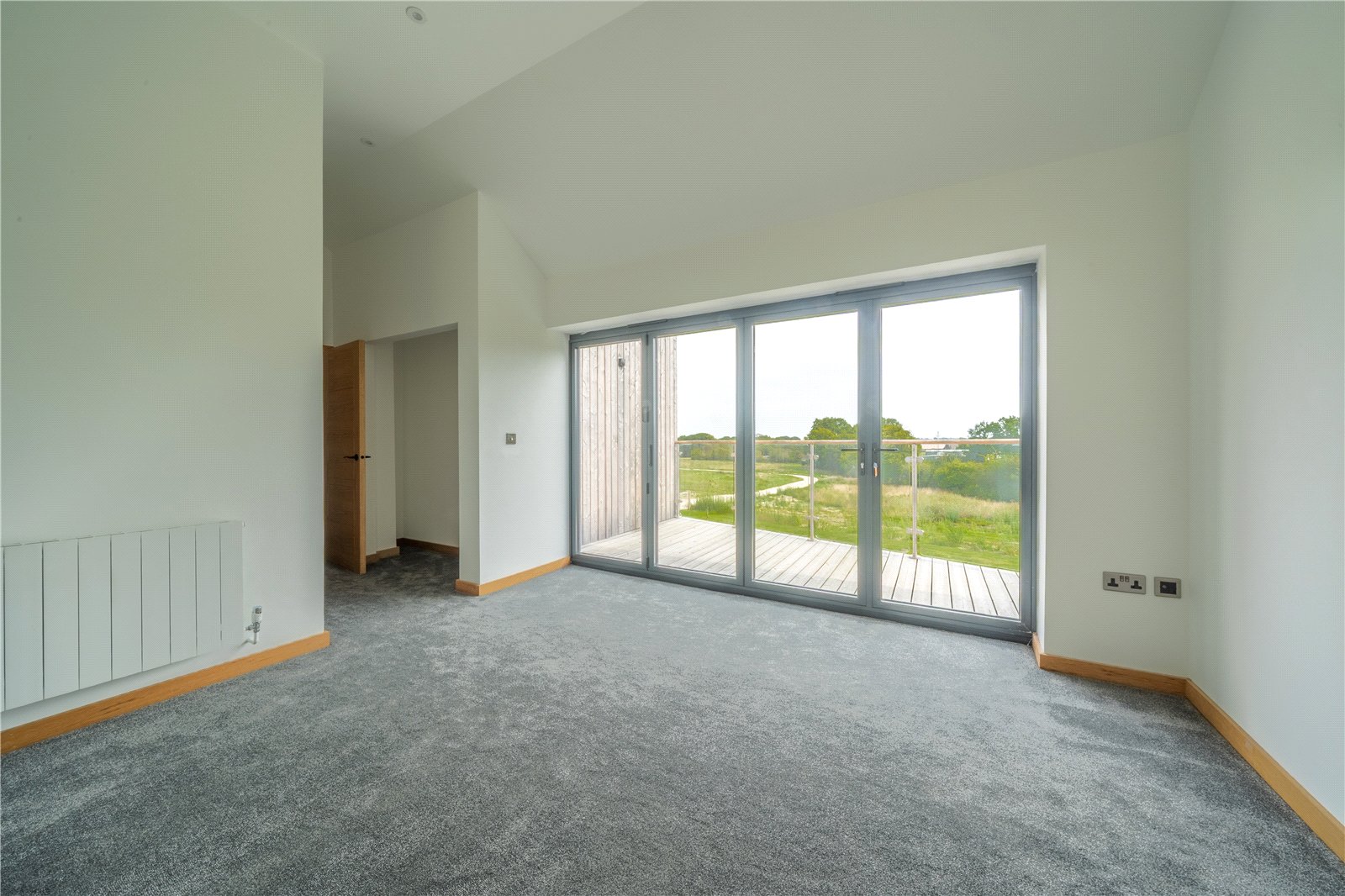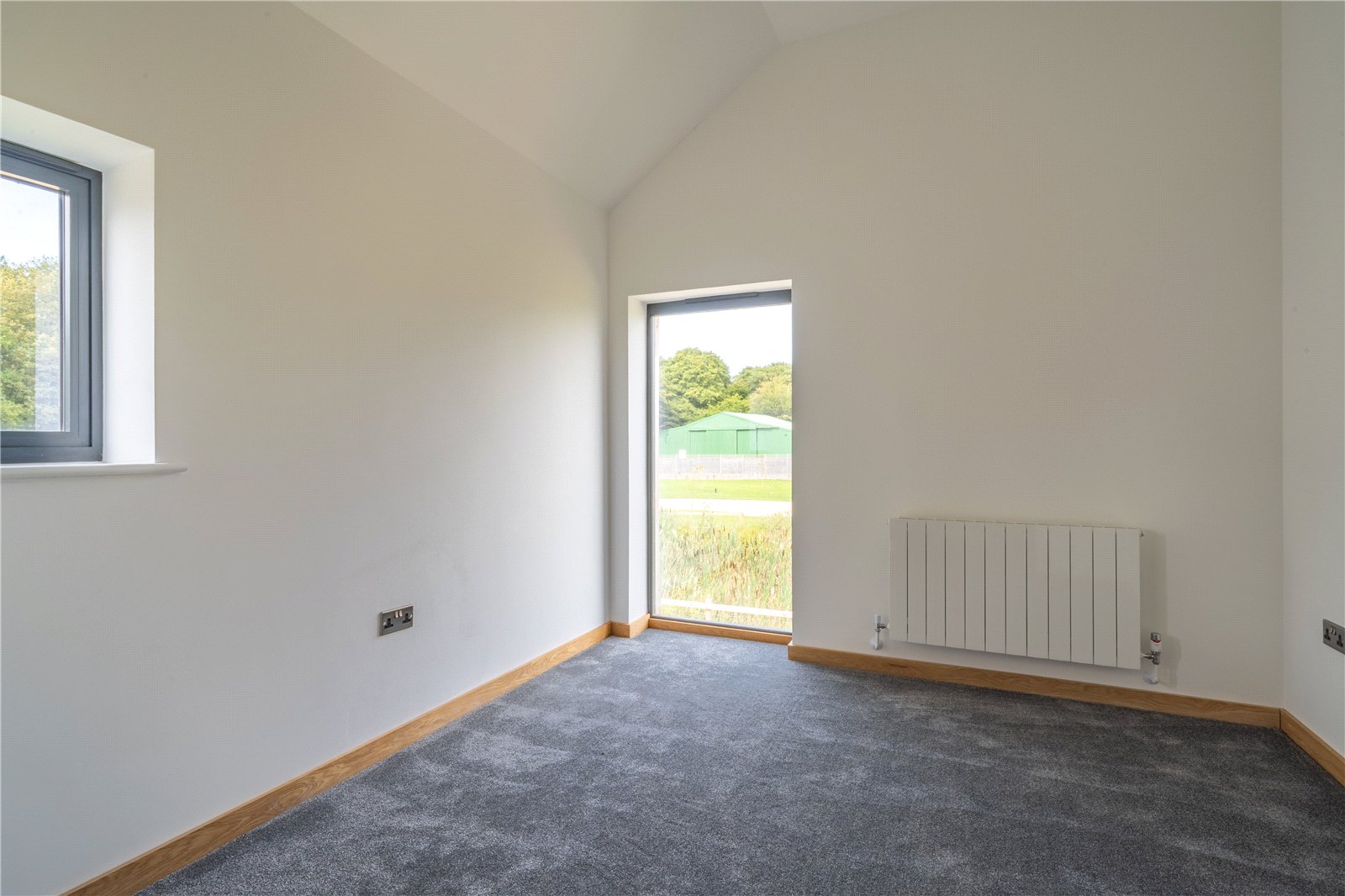 BEDROOM 2: This generously sized double bedroom is bathed in natural light, thanks to its striking corner window feature which frames far-reaching views across the surrounding countryside. Finished with soft carpeting, neutral décor, and oak detailing, it provides a calm and elegant retreat.