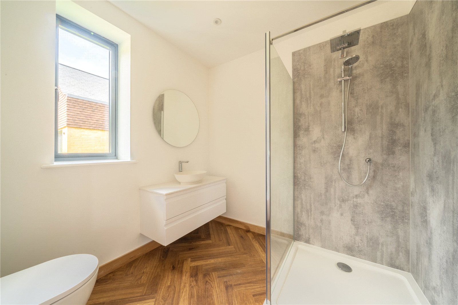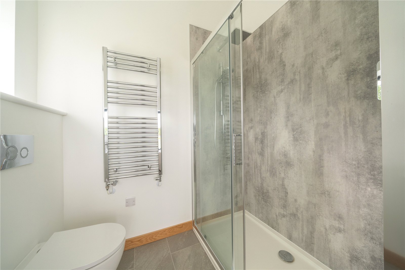 DOWNSTAIRS SHOWER ROOM: Conveniently positioned on the ground floor, this stylish shower room is finished to a high standard and features a glazed shower enclosure with rainfall shower, wall-hung WC, and a chrome heated towel rail. Contemporary tiling adds a sleek, modern look, while the neutral tones and clean lines create a bright and practical space, perfect for both family use and visiting guests.