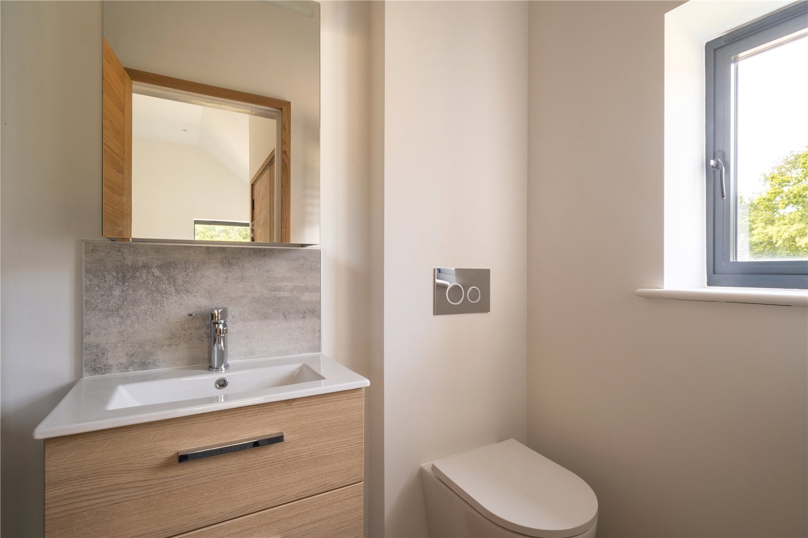 EN-SUITE: Finished in a contemporary style, the en-suite is fitted with a modern vanity unit with inset basin and storage, a wall-hung WC, and complementary tiled splashback. A large mirror and chrome fittings enhance the sense of light and space, while the window provides natural ventilation. Designed with clean lines and neutral tones, it offers a sleek and practical private bathroom space.