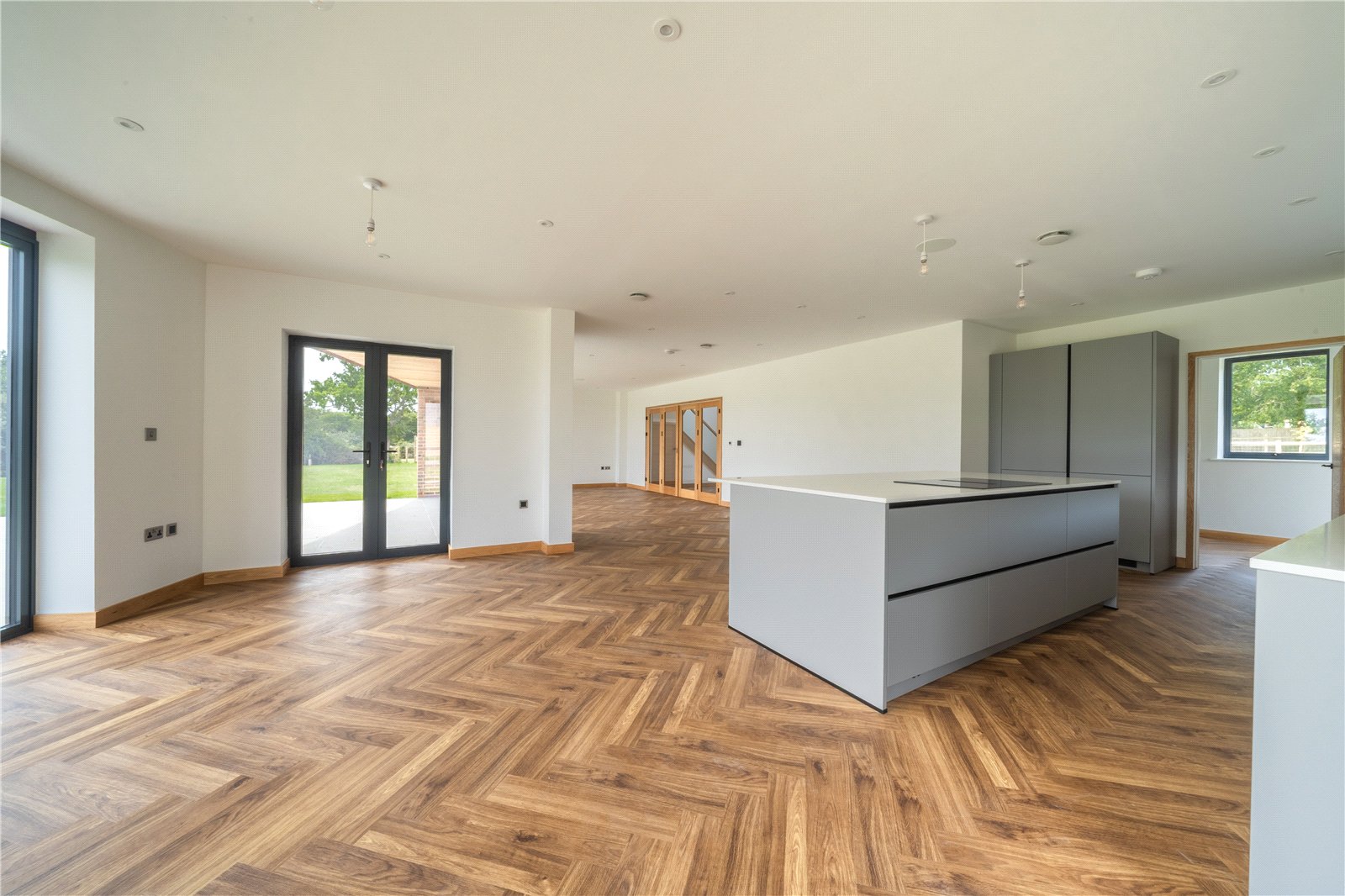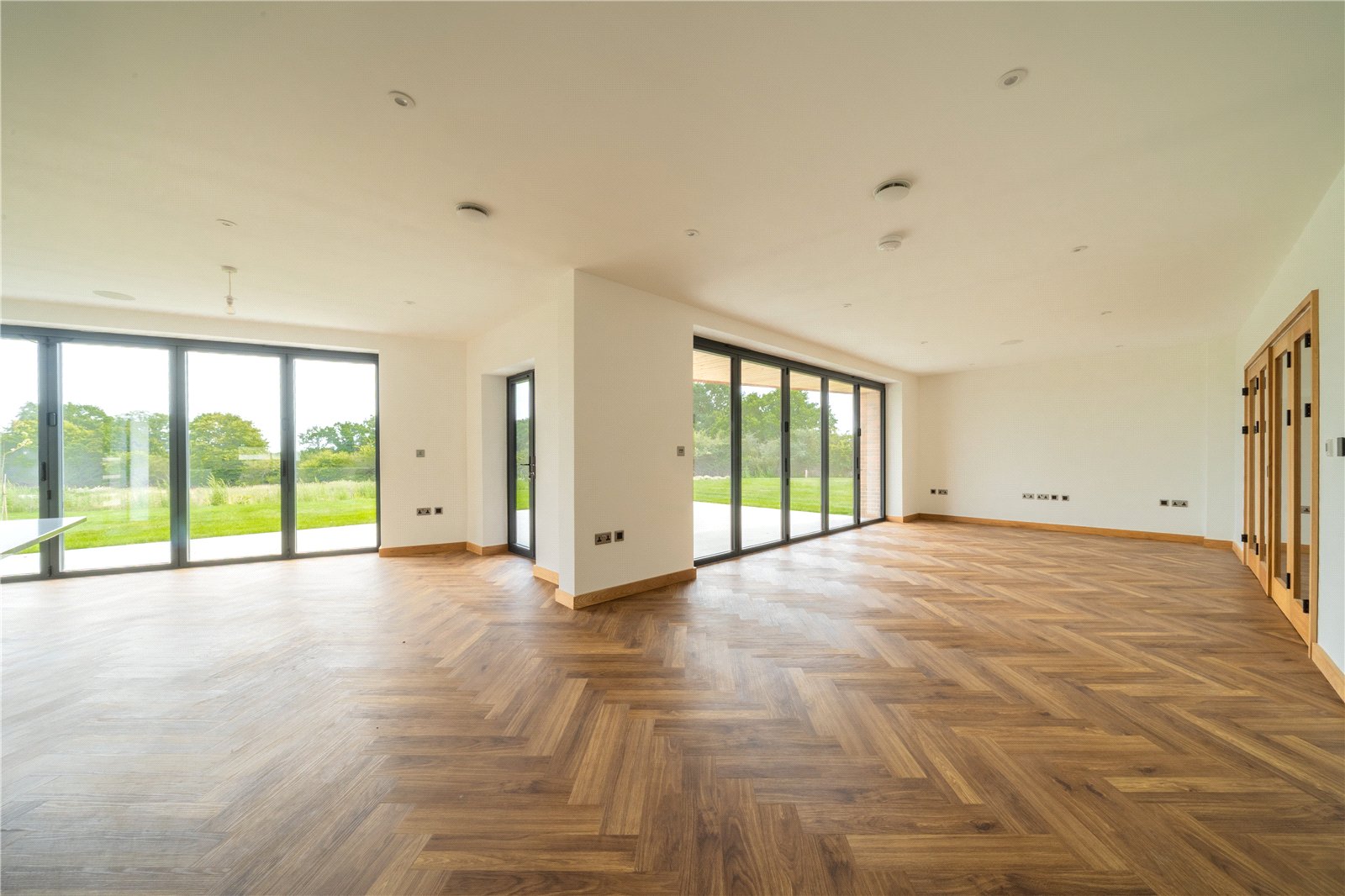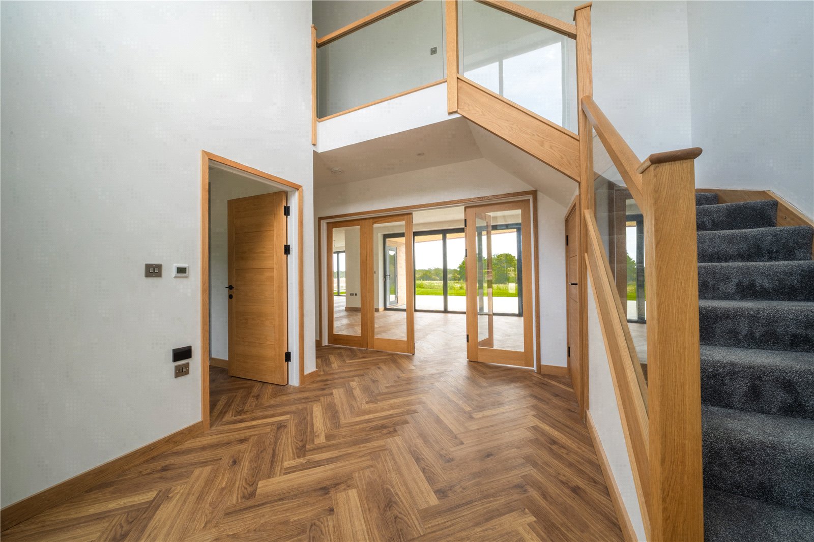 ENTRANCE HALL: A striking double-height entrance hall creates an immediate sense of space and light, setting the tone for the rest of the property. The bespoke oak staircase with glass balustrade provides a contemporary focal point, while the expansive glazed double doors open through to the main living areas, offering a seamless flow. The herringbone flooring adds warmth and sophistication, complemented by oak internal doors and detailing throughout. This impressive entrance is both welcoming and architecturally designed to make a lasting first impression.