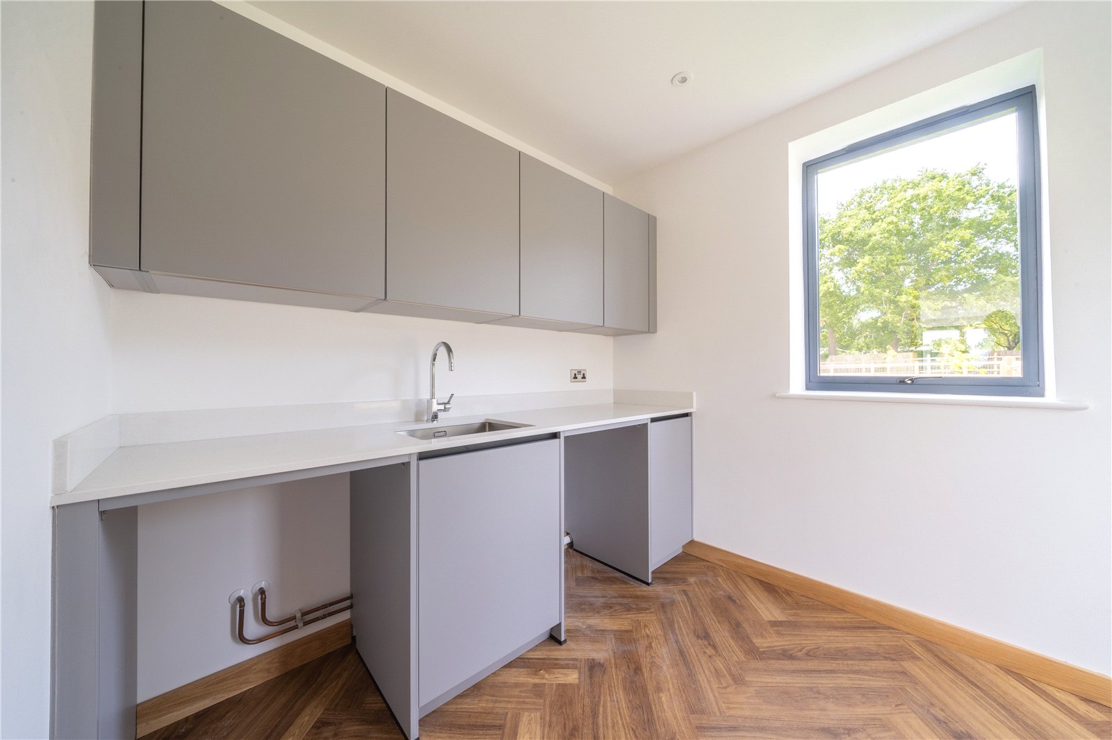 UTILITY ROOM: Designed with practicality in mind, the utility room is fitted with a matching range of sleek cabinetry, work surfaces, and a stainless steel sink, providing an ideal space for laundry and household tasks. Plumbing and service points are in place for appliances, keeping the main kitchen free for entertaining and day-to-day family living. A large window allows natural light to fill the room, while the continuation of the herringbone flooring ties it seamlessly into the rest of the home.