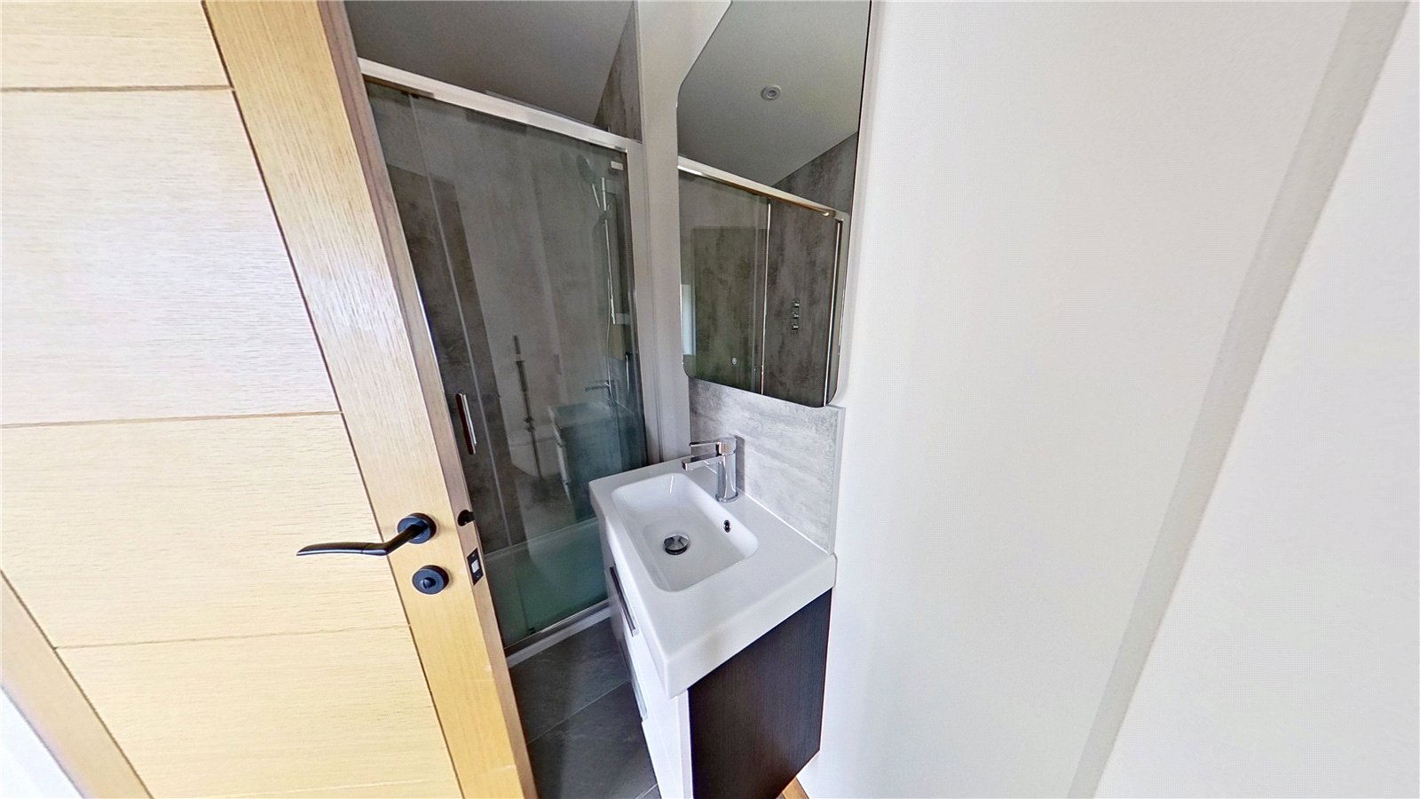 EN-SUITE: The private en-suite is fitted with a contemporary suite, including a glazed shower enclosure with rainfall shower, a sleek vanity unit with inset basin and storage, a WC, and modern chrome fittings. Finished with stylish wall tiling and a large mirror, it offers both practicality and luxury.