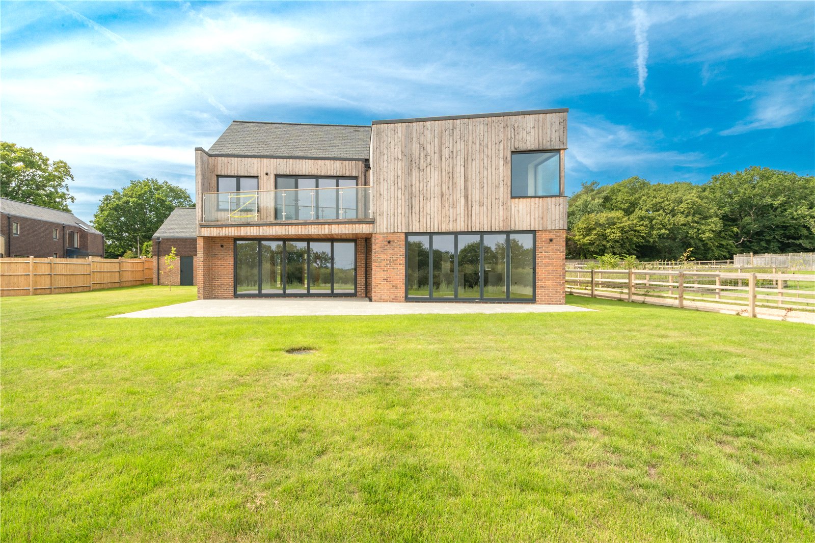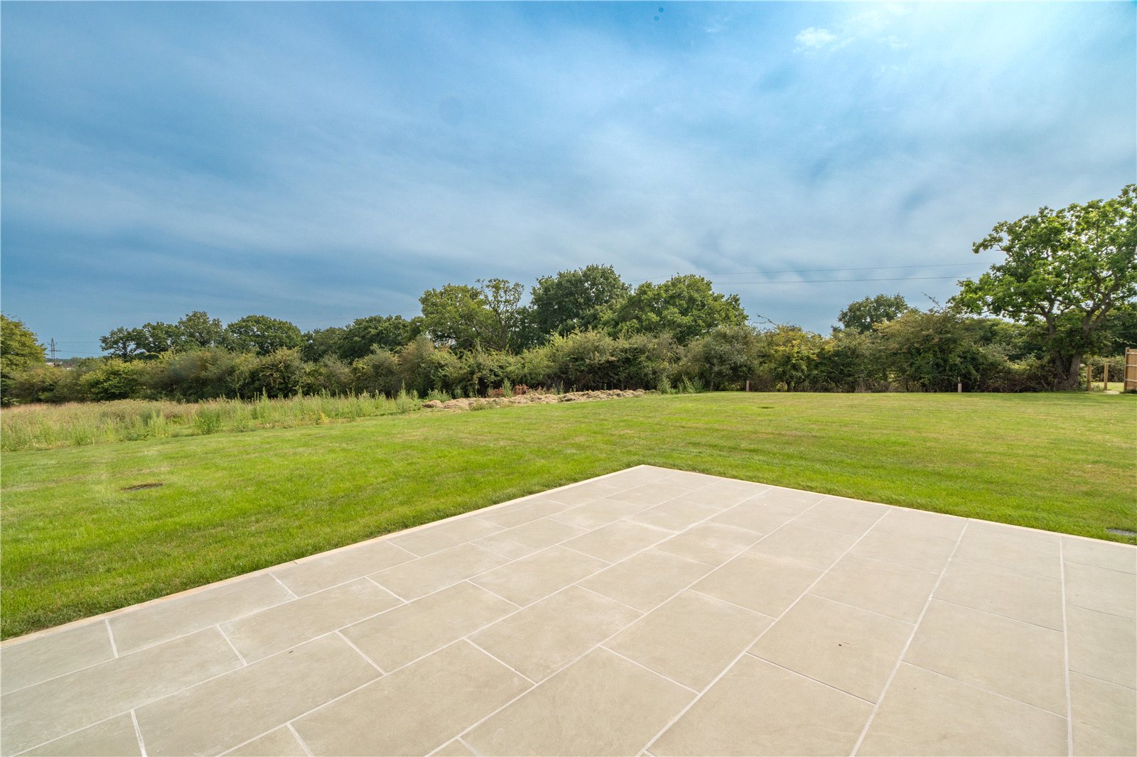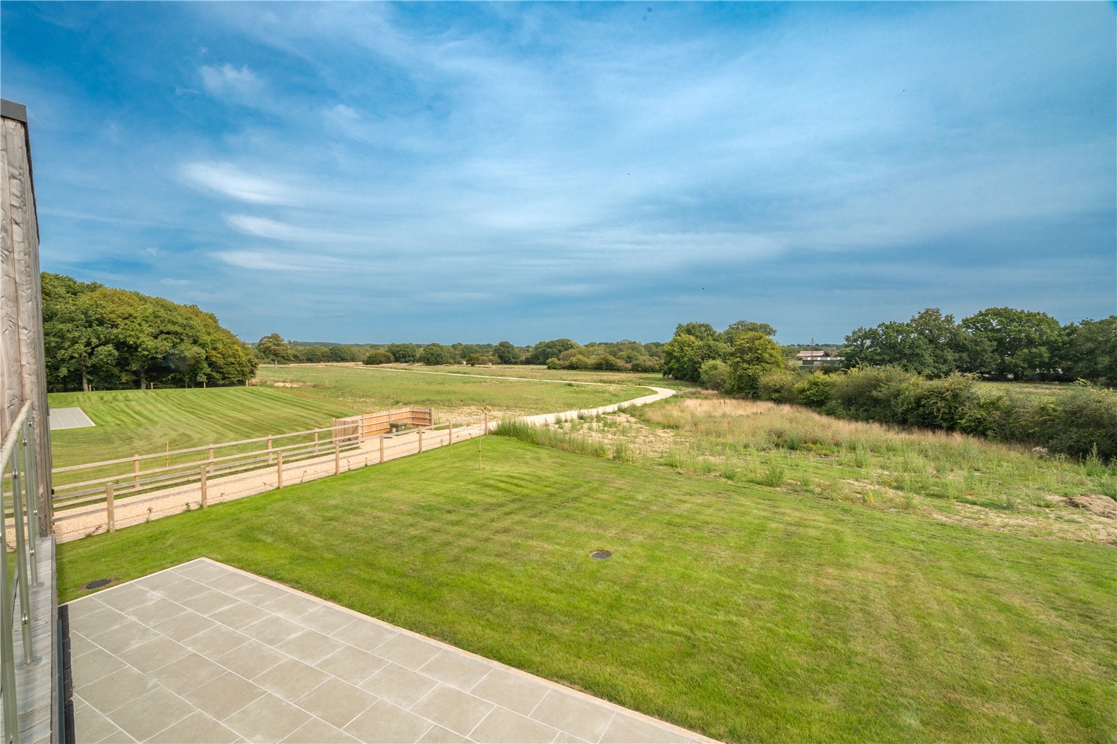 To the rear, full-height glazing opens directly onto a generous stone terrace, ideal for entertaining and outdoor dining, while the large level lawn beyond enjoys a delightful open outlook across neighbouring countryside. The garden is securely enclosed with post-and-rail and close-board fencing, offering both privacy and security, making it perfectly suited for families.